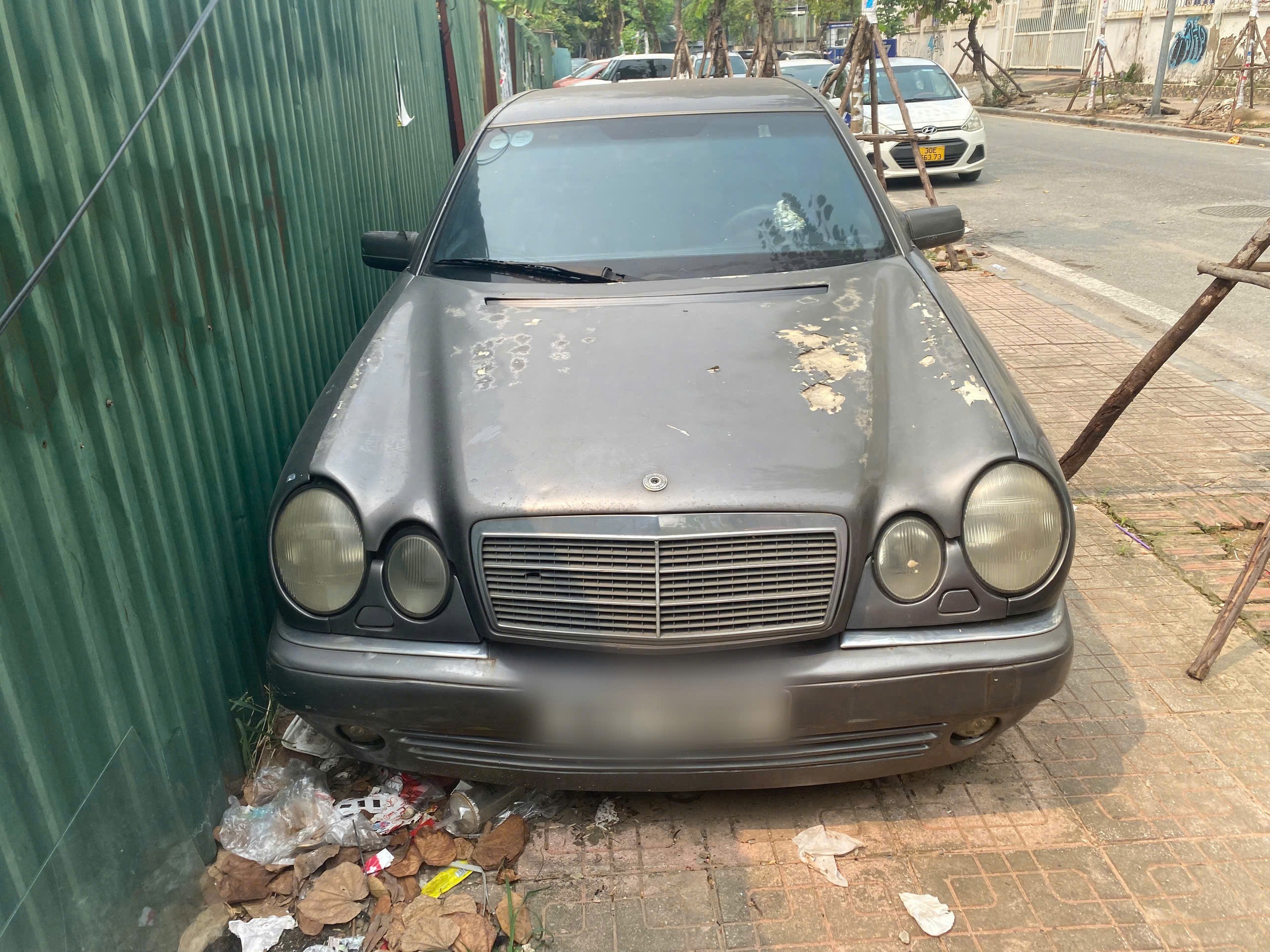 Cách đó không xa, chiếc Mercedes-Benz E230 khá hơn khi vẫn giữ được hình dạng ban đầu. Lớp sơn bị bong tróc, gương chiếu hậu hư hỏng và đèn pha đã ố vàng, mờ đục. Toàn bộ xe đóng kín bởi bụi dày nhưng không hỏng hóc nhiều về ngoại quan.