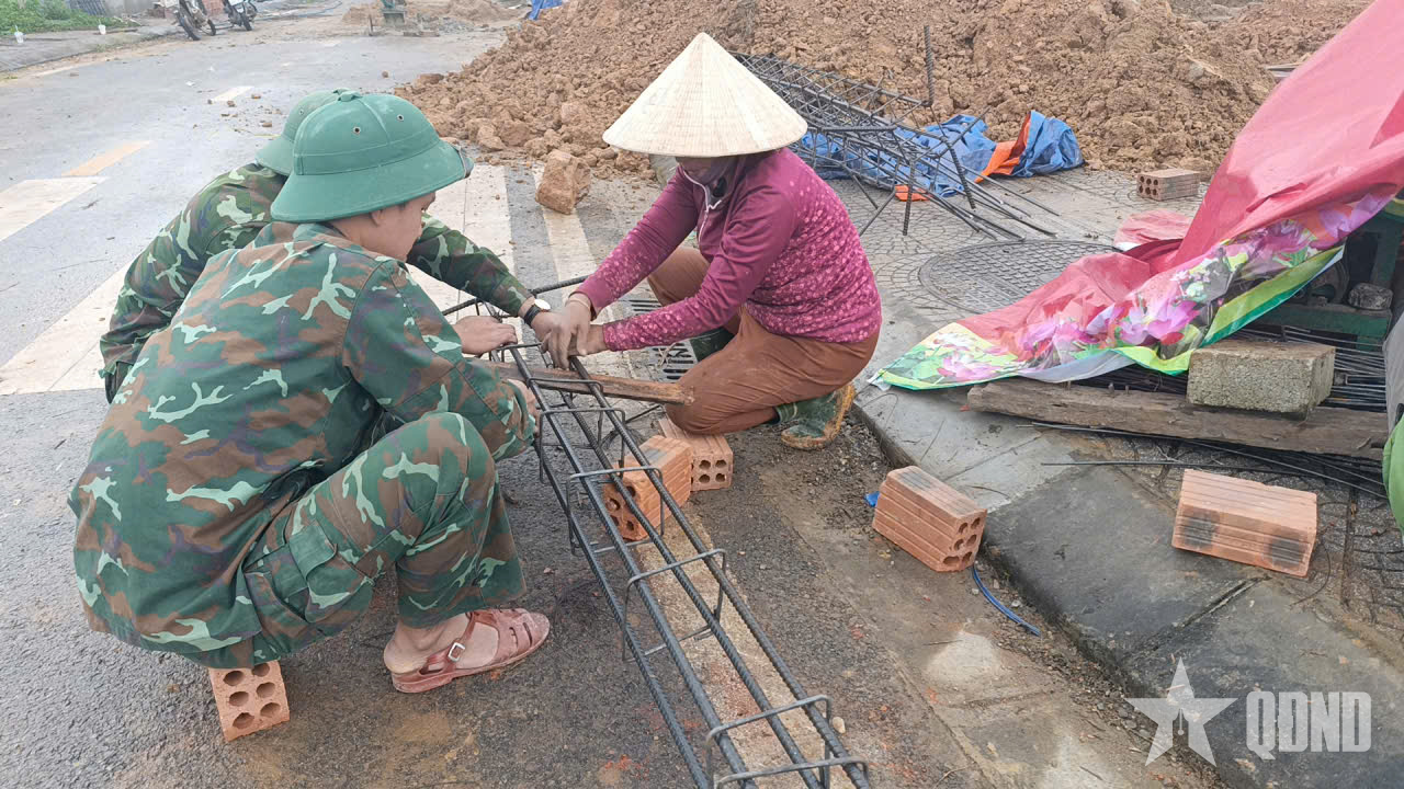 Tranh thủ mọi thời gian giúp các gia đình buộc thép đổ bê tông xây dựng nhà ở.