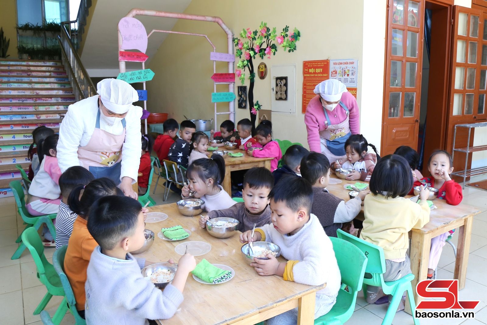 Bữa ăn bán trú của học sinh Trường Mầm non Vân Hồ.