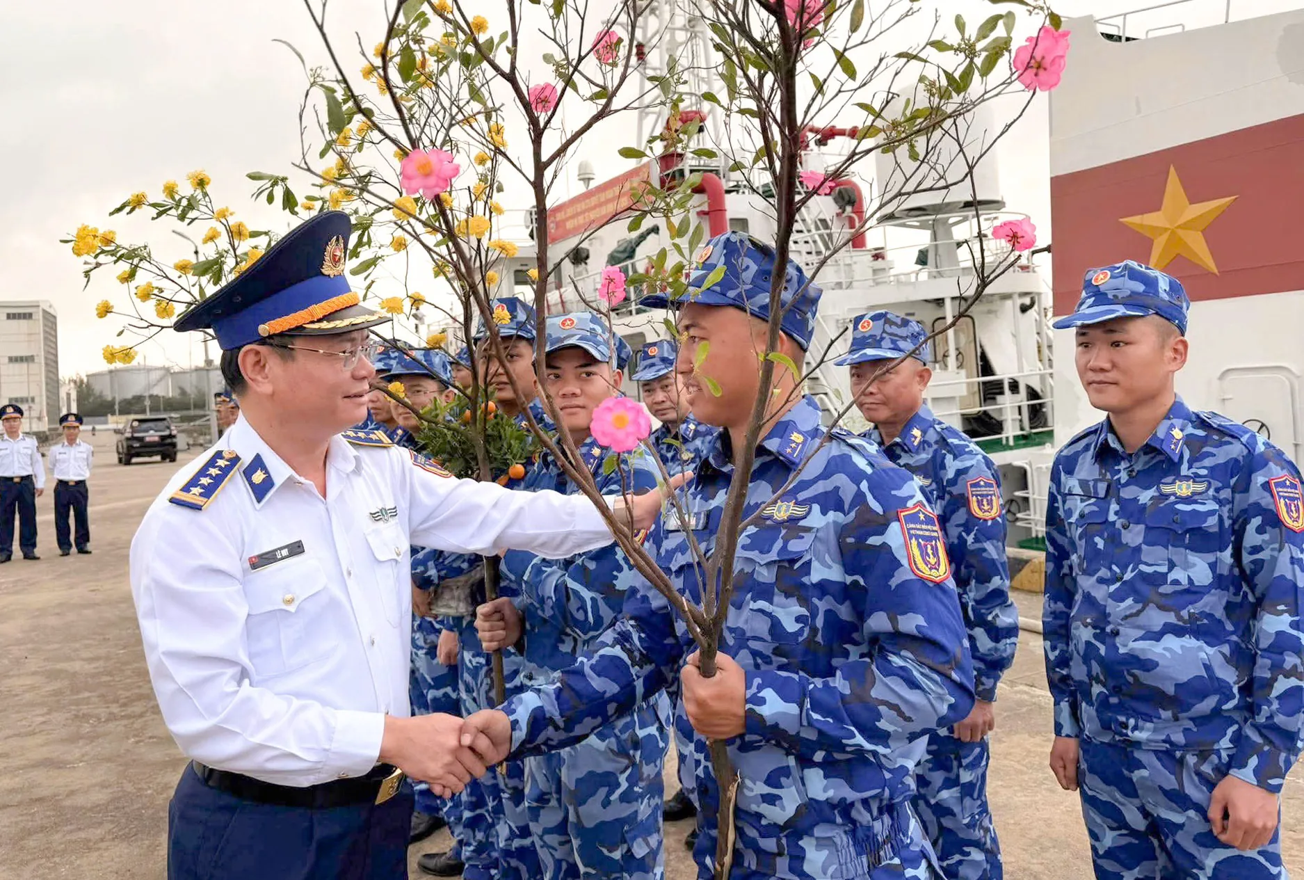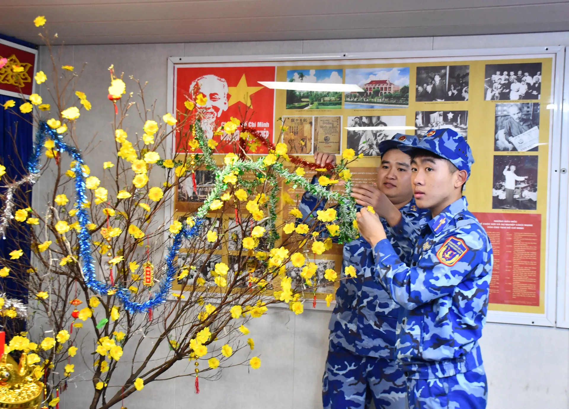 Giữa đại dương, con tàu trở thành “ngôi nhà” đặc biệt. Để bảo đảm đời sống tinh thần cho cán bộ, chiến sĩ, song hành cùng nhiệm vụ, mỗi tàu đều tranh thủ giờ nghỉ để trang trí đón Xuân. Chậu quất được vận chuyển lên tàu còn tươi rói; những cành đào, cành mai gắn hoa lụa vẫn duyên dáng, rực rỡ... càng làm cho không gian thêm ấm cúng.