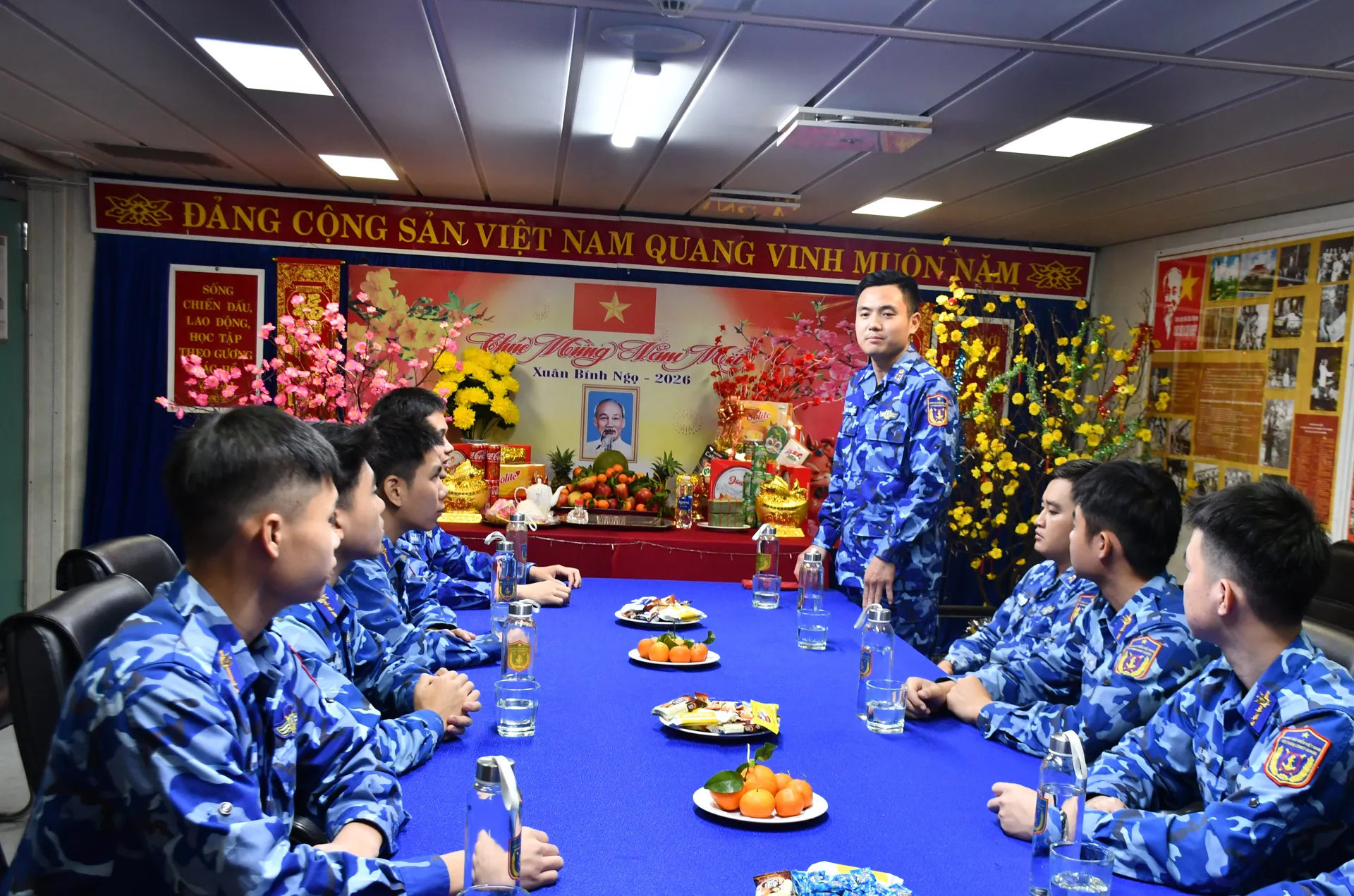 Trong phòng đón xuân, ảnh Bác Hồ được đặt ở vị trí trang trọng. Màu cờ đỏ, sắc hoa tươi, những gói bánh kẹo, túi mứt Tết, bánh chưng… đem hương vị truyền thống đủ đầy đến giữa biển xa.