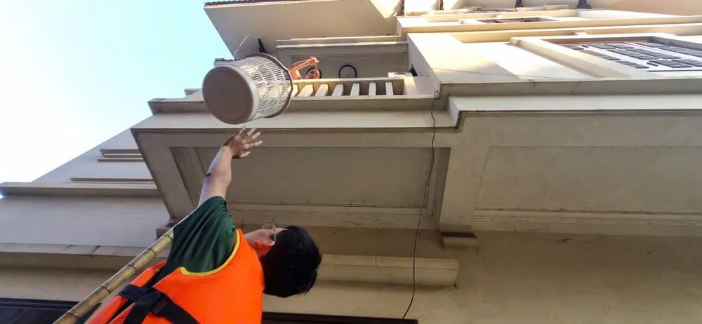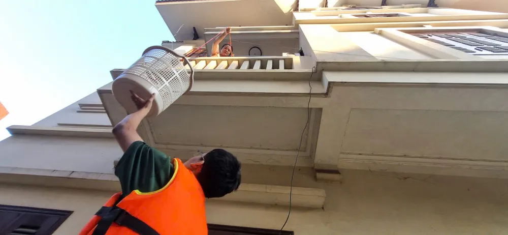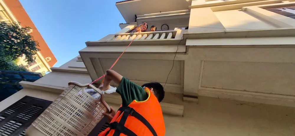 Nhiều căn nhà khóa kín tầng một, chỉ có thể tiếp cận qua ban công tầng hai. Thế là những chiếc rổ nhựa, dây thừng trở thành “cầu nối” để hộp cơm nóng được chuyền lên cao.