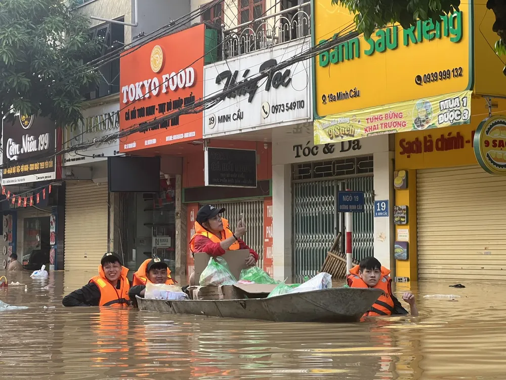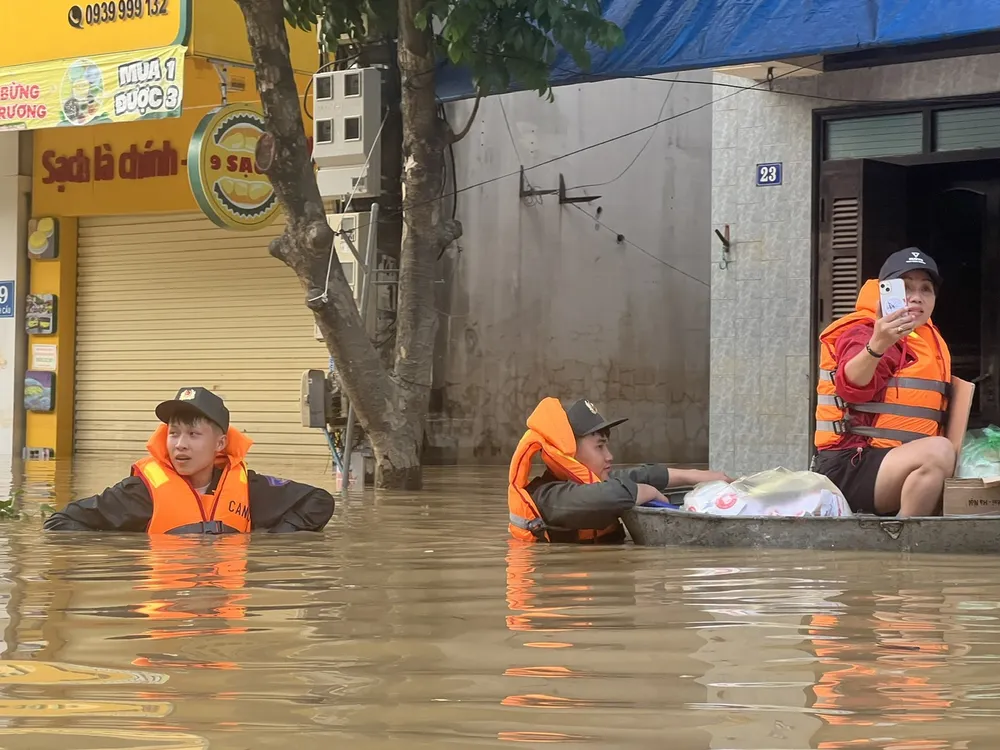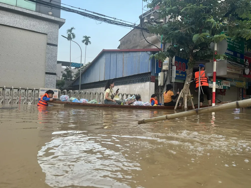 Trên các tuyến phố ngập sâu, hình ảnh quen thuộc nhất những ngày này là bóng áo phao cam nổi bật giữa dòng nước đục. Đó là lực lượng chức năng cùng các tình nguyện viên mang theo những túi cơm hộp, nước uống, chèo thuyền len lỏi từng ngõ. Có người phải ngâm mình trong nước lũ lạnh buốt, giơ cao túi đồ để không bị ướt.