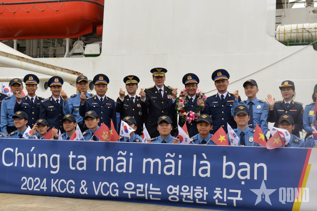 Cán bộ, nhân viên Lực lượng Bảo vệ bờ biển Hàn Quốc đón Tàu CSB 8004 và đoàn Cảnh sát biển Việt Nam đến thăm, tháng 11-2024.