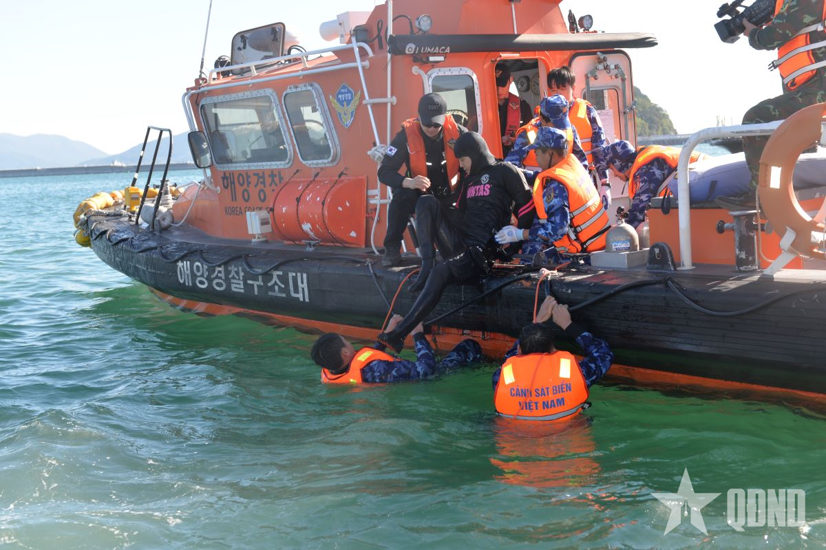 Chiến sĩ Cảnh sát biển Việt Nam luyện tập cứu nạn dưới nước với nhân viên Lực lượng Bảo vệ bờ biển Hàn Quốc, tháng 11-2024.