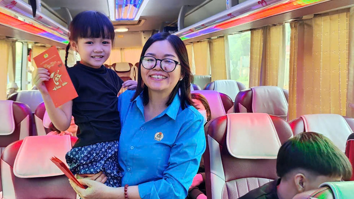 Công đoàn lì xì cho con công nhân trước khi xe khởi hành (ảnh: N.Hòa)