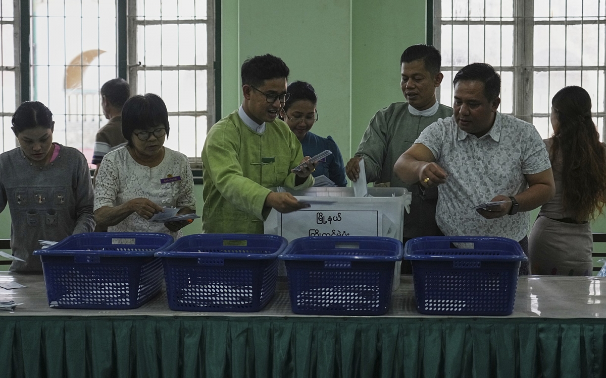 Chuẩn bị kiểm phiếu bỏ sớm tại một điểm bỏ phiếu trong bầu cử Myanmar 2025. Ảnh: AP.