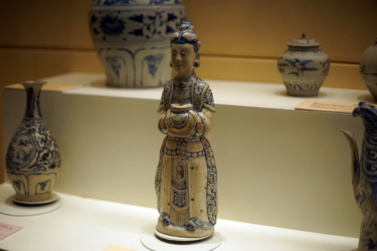Tượng phụ nữ quý tộc làm bằng gốm hoa lam dát vàng kim, thời Lê sơ, thế kỷ 15 tìm thấy ở tàu cổ Cù Lao Chàm, Hội An, Quảng Nam. Ảnh: Quốc Lê.