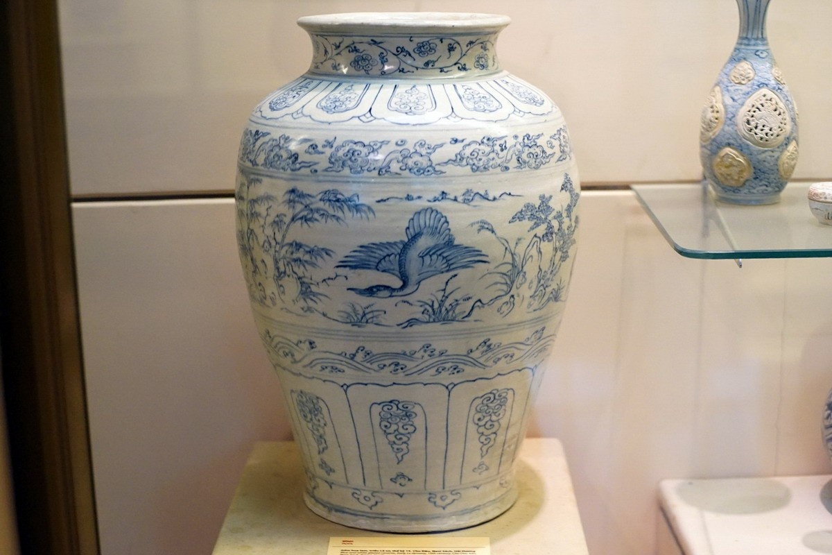 Bảo vật quốc gia Bình gốm hoa lam vẽ thiên nga, thời Lê sơ, thế kỷ 15 tìm thấy ở tàu cổ Cù Lao Chàm, Hội An, Quảng Nam. Ảnh: Quốc Lê.