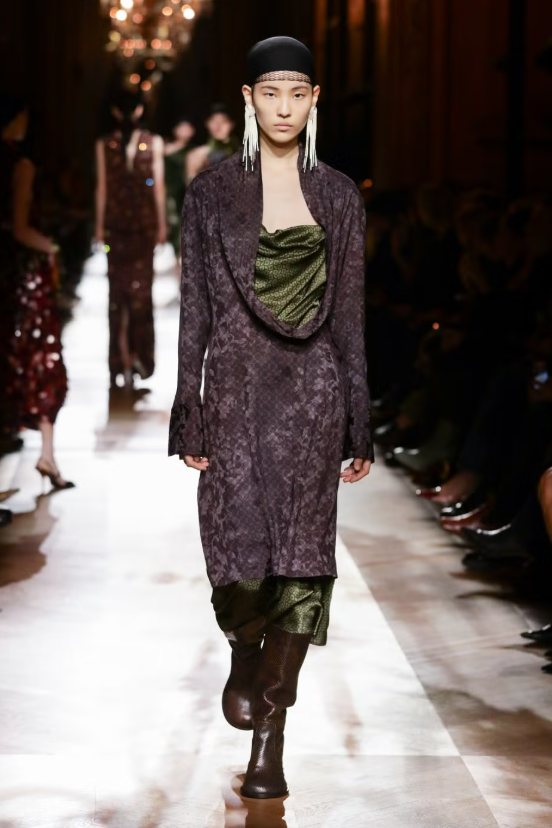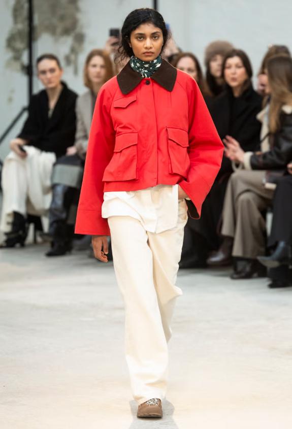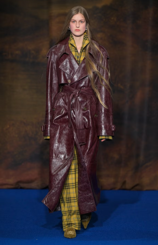Đỏ rượu và xanh olive: Sắc xanh olive dịu nhẹ làm giảm độ rực rỡ của đỏ rượu vang, tạo nên tổng thể vừa thanh lịch vừa mạnh mẽ, mang hơi hướng utilitarian. Bạn có thể bắt đầu với một chiếc áo khoác nổi bật thuộc một trong hai tông màu này. Bên trong, kết hợp áo len đỏ rượu vang cùng chân váy lụa xanh mềm mại, hoặc quần satin màu xanh kiểu cargo. Hoàn thiện set đồ bằng phụ kiện da hoặc trang sức vàng cổ điển để tổng thể hài hòa và tinh tế. Ảnh: Elle