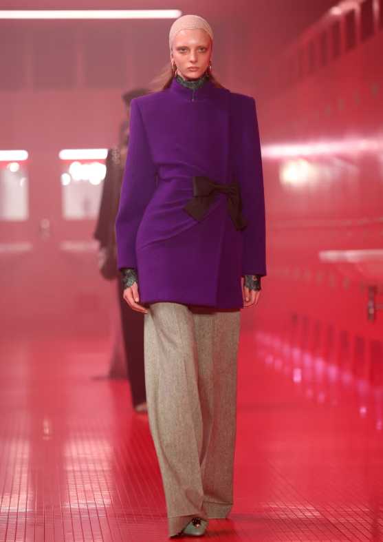Tím và xám: Dù là tím cà tím, tím oải hương hay tím violet, đây vẫn là gam màu chủ đạo của mùa. Khi diện nguyên bộ cùng tông, sắc tím mang vẻ sang trọng, quyền quý. Ngược lại, khi kết hợp với những tông lạnh như xám đá hay xám bạc, màu tím càng trở nên nổi bật. Bạn có thể thử vest xám đi cùng túi màu nho đậm khi đi làm, hoặc chân váy bạc lấp lánh phối cùng giày tím đậm cho những buổi tiệc lễ hội. Ảnh: Elle