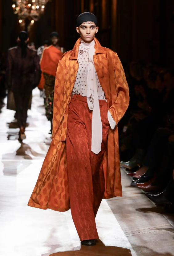 Cam và nâu: Ban ngày, bạn có thể kết hợp áo polo màu đỏ cam với quần thể thao màu hạt dẻ, trong khi buổi tối hãy nâng tầm set đồ với áo khoác satin màu cam cháy phối cùng quần da màu cà phê, hoặc váy lụa màu nâu đỏ nhạt, kết hợp áo khoác da nâu sẫm. Những phụ kiện bằng da hoặc da lộn tông nâu đơn giản sẽ giúp tổng thể trở nên đồng bộ và tinh tế. Ảnh: Elle