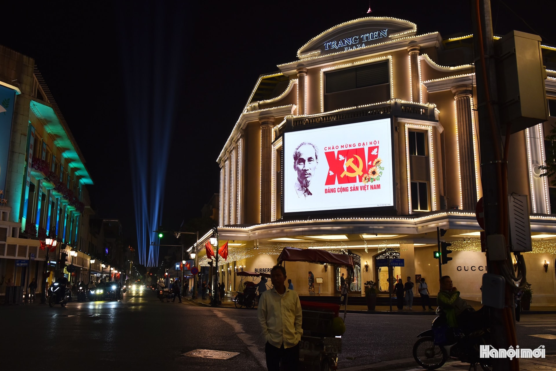 Màn hình LED chào mừng Đại hội Đảng tại Tràng Tiền Plaza thắp sáng khu vực trung tâm, thu hút dòng người giữa đêm Hà Nội.