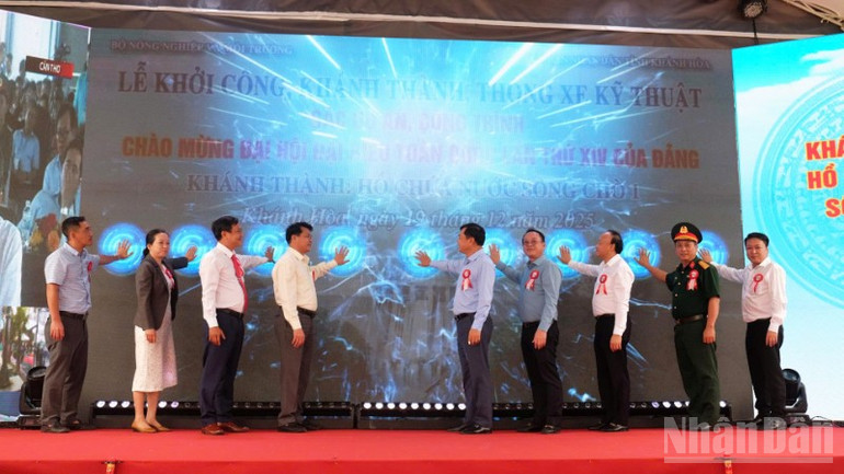 Lãnh đạo Bộ Nông nghiệp và Môi trường và tỉnh Khánh Hòa ấn nút khánh thành hồ chứa nước Sông Chò 1, công trình trọng điểm chào mừng Đại hội Đảng lần thứ XIV. (Ảnh: NGUYỄN TRUNG)