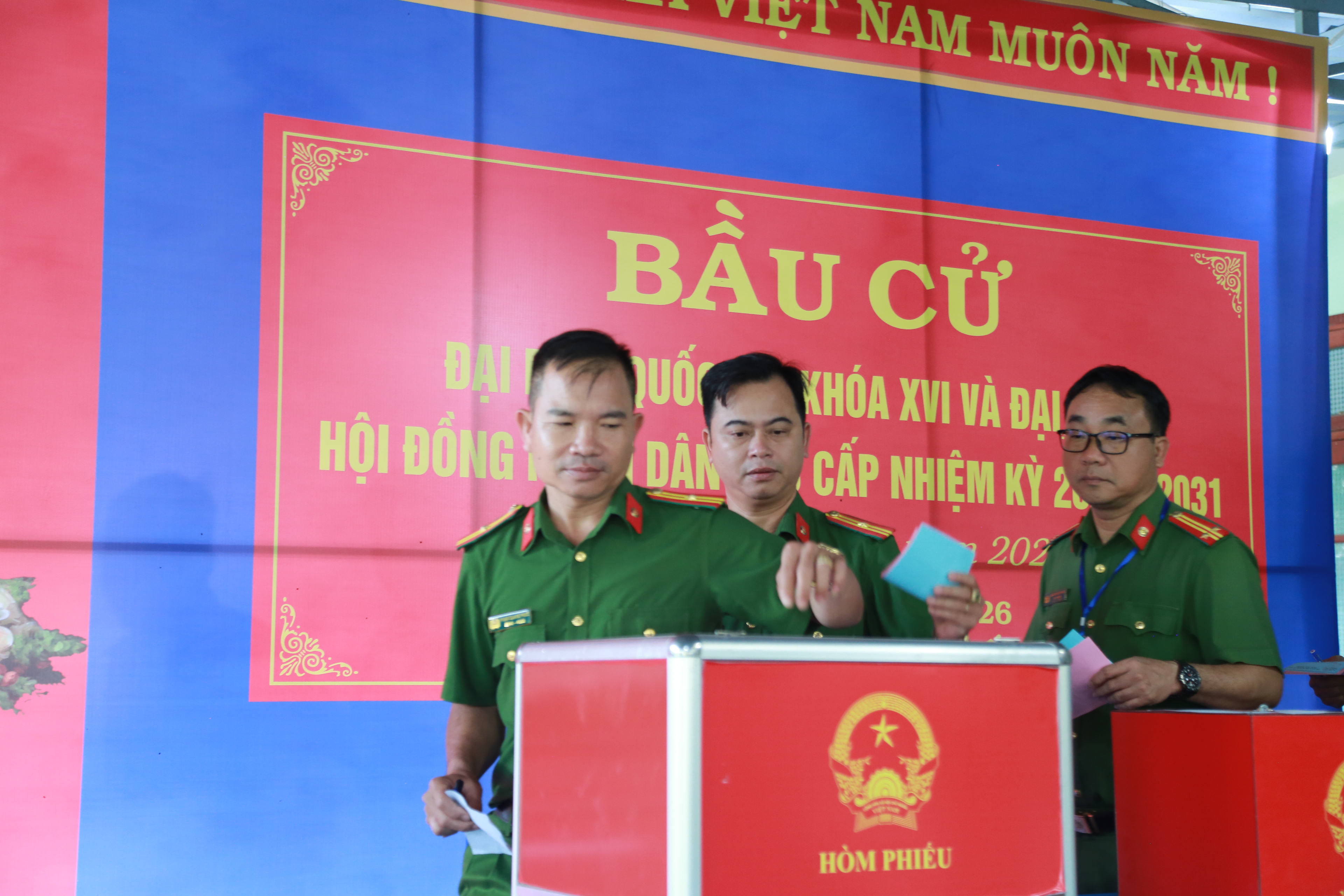 Từ sáng sớm, công tác tổ chức bầu cử được chuẩn bị chu đáo, bảo đảm an toàn tuyệt đối, đúng quy định. Trong không khí nghiêm túc, trật tự, từng cử tri được cán bộ hướng dẫn thực hiện đầy đủ các bước của quy trình bầu cử.