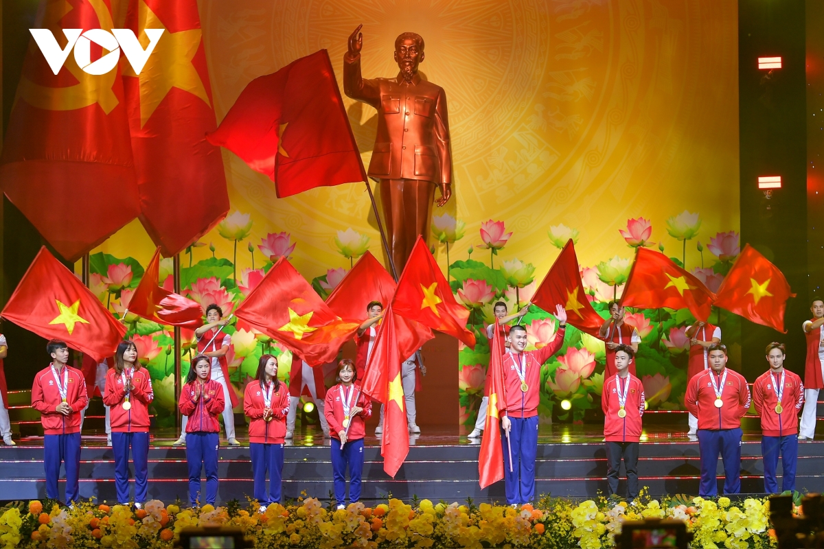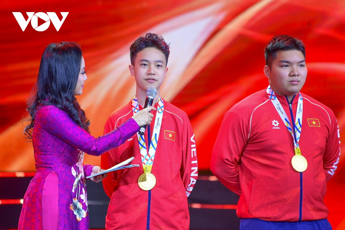 Các VĐV tiêu biểu của thể thao Việt Nam, những người vừa mang vinh quang về cho Tổ quốc tại SEA Games 33 lên sân khấu giao lưu tại Đại hội Thi đua yêu nước lần thứ XI.