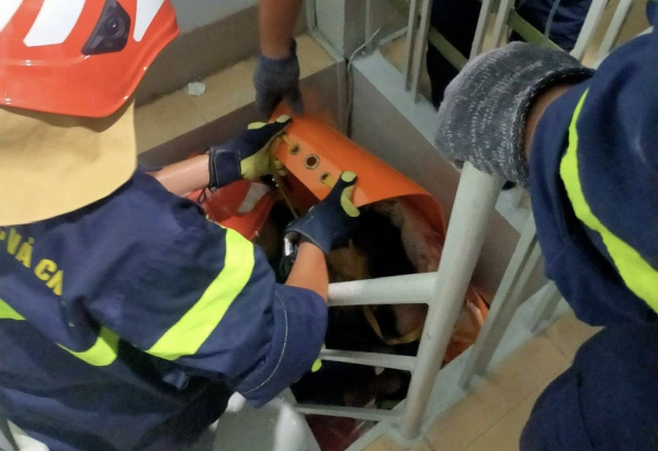 Cầu thang thẳng đứng nhỏ hẹp, dạng xoắn là thách thức lớn trong việc di chuyển nạn nhân từ các tầng cao xuống đất.