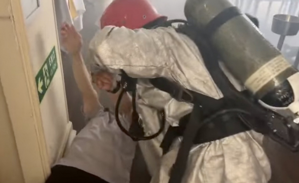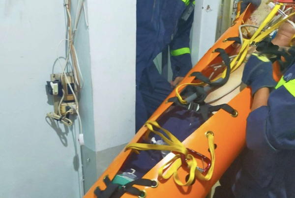 Khi tổ công tác đến nạn nhân đang nguy kịch, khó thở. Căn nhà khá nhỏ, cầu thang từ đất lên tầng 2 chỉ lọt vừa một người có thể trạng bình thường, lại thiết kế dạng xoắn. Tại tầng 2, ông cụ nằm dưới nền gạch bất tỉnh, cụ bà lớn tuổi chỉ có thể ngồi nhìn mọi người sơ cứu mà không thể làm gì vì già yếu. Lúc này tổ cứu nạn, cứu hộ tiếp cận kiểm tra dấu hiệu sinh tồn, hỗ trợ hô hấp và cố định cụ ông vào cán cứu thương mềm.