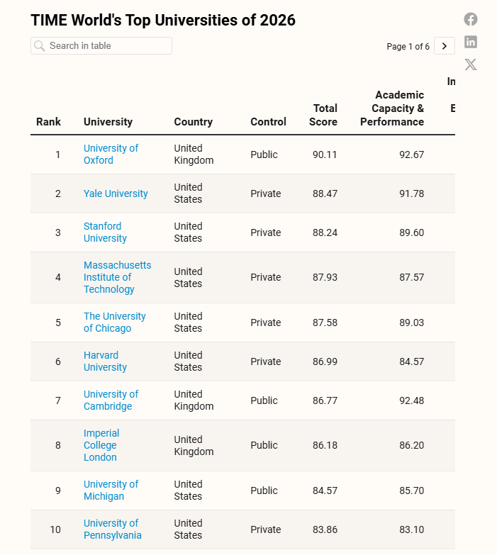 Bảng xếp hạng của Time được xem là một trong nhiều thước đo tham khảo về chất lượng giáo dục đại học toàn cầu. Dù phương pháp đánh giá giữa các tổ chức có khác biệt, các kết quả xếp hạng tiếp tục cho thấy sự cạnh tranh gay gắt giữa các trường đại học trong việc nâng cao chất lượng đào tạo, nghiên cứu, cũng như mở rộng cơ hội tiếp cận giáo dục cho người học trong bối cảnh quốc tế hóa ngày càng sâu rộng.