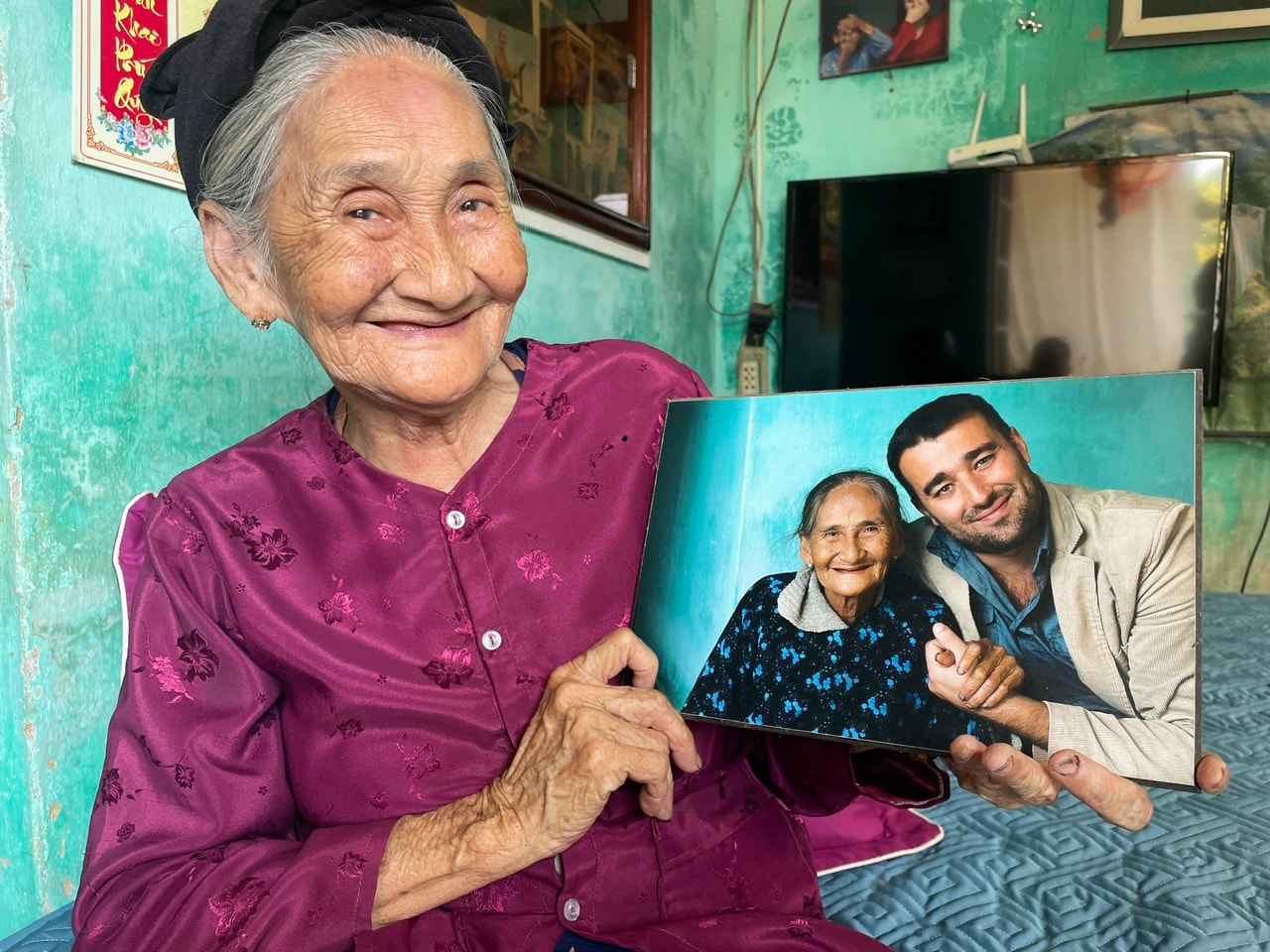 Cụ Song với tấm ảnh chụp chung với nhiếp ảnh gia Réhahn. Ảnh: C.P