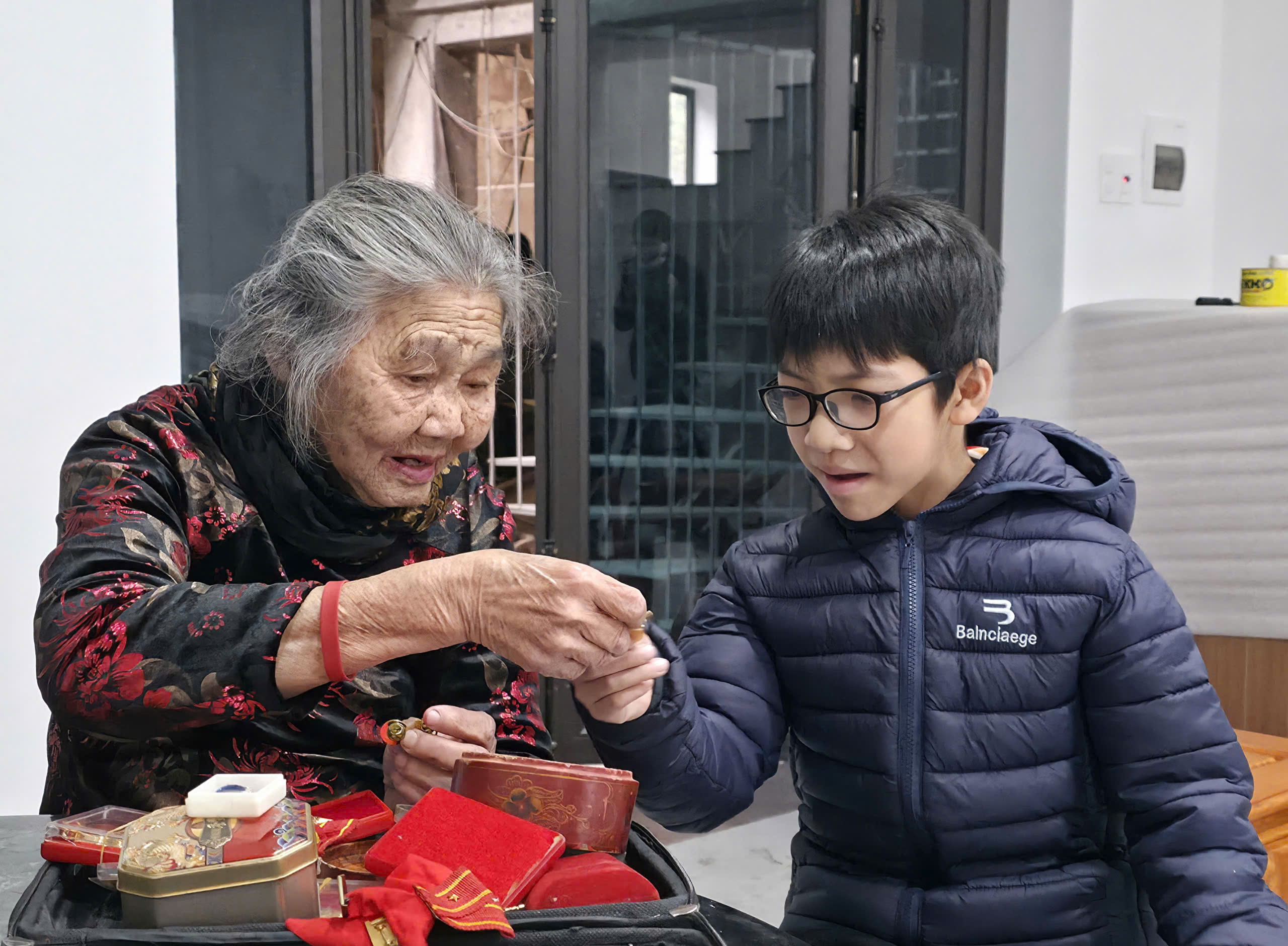 Đảng viên cao tuổi Nguyễn Thị Tài, Chi bộ tổ dân phố 21, phường Nùng Trí Cao cùng con cháu xem lại những danh hiệu được tặng thưởng.