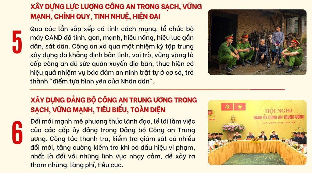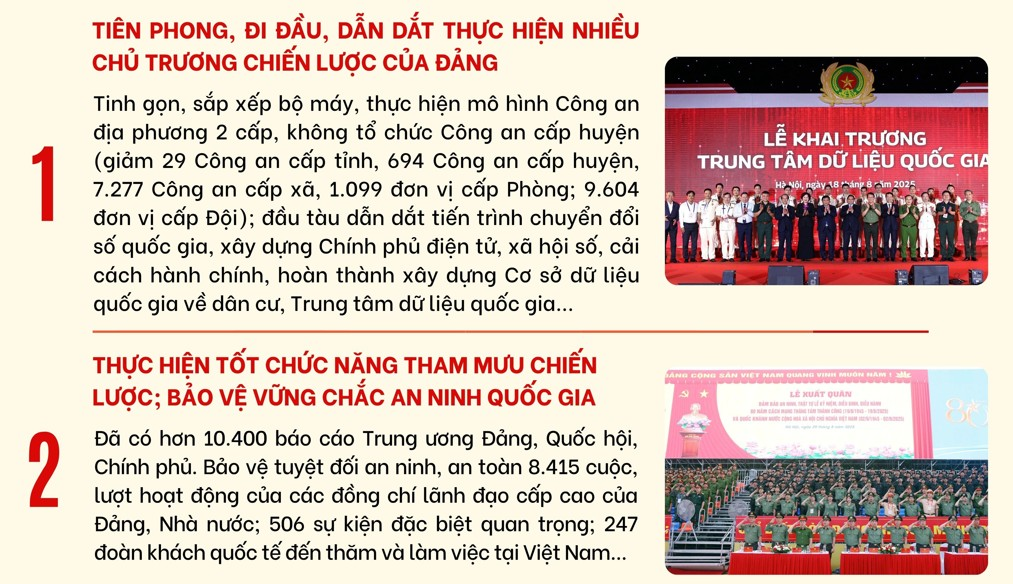 Nổi bật là, Đảng ủy Công an Trung ương đã tiên phong, đi đầu, dẫn dắt thực hiện nhiều chủ trương chiến lược của Đảng; thực hiện tốt chức năng tham mưu chiến lược, bảo vệ vững chắc an ninh quốc gia; triển khai quyết liệt, đồng bộ các giải pháp phòng, chống tội phạm, tạo chuyển biến tích cực về trật tự, an toàn xã hội; xây dựng lực lượng Công an nhân dân cách mạng, chính quy, tinh nhuệ, hiện đại; xây dựng Đảng bộ Công an Trung ương trong sạch, vững mạnh, tiêu biểu, toàn diện...