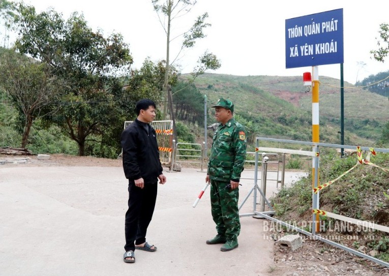 Cán bộ Tổ công tác Đồn Biên phòng cửa khẩu Chi Ma túc trực tại barie thôn Quân Phát (xã Mẫu Sơn) tuyên truyền quy định về xuất nhập cảnh đến người dân khi qua lại biên giới