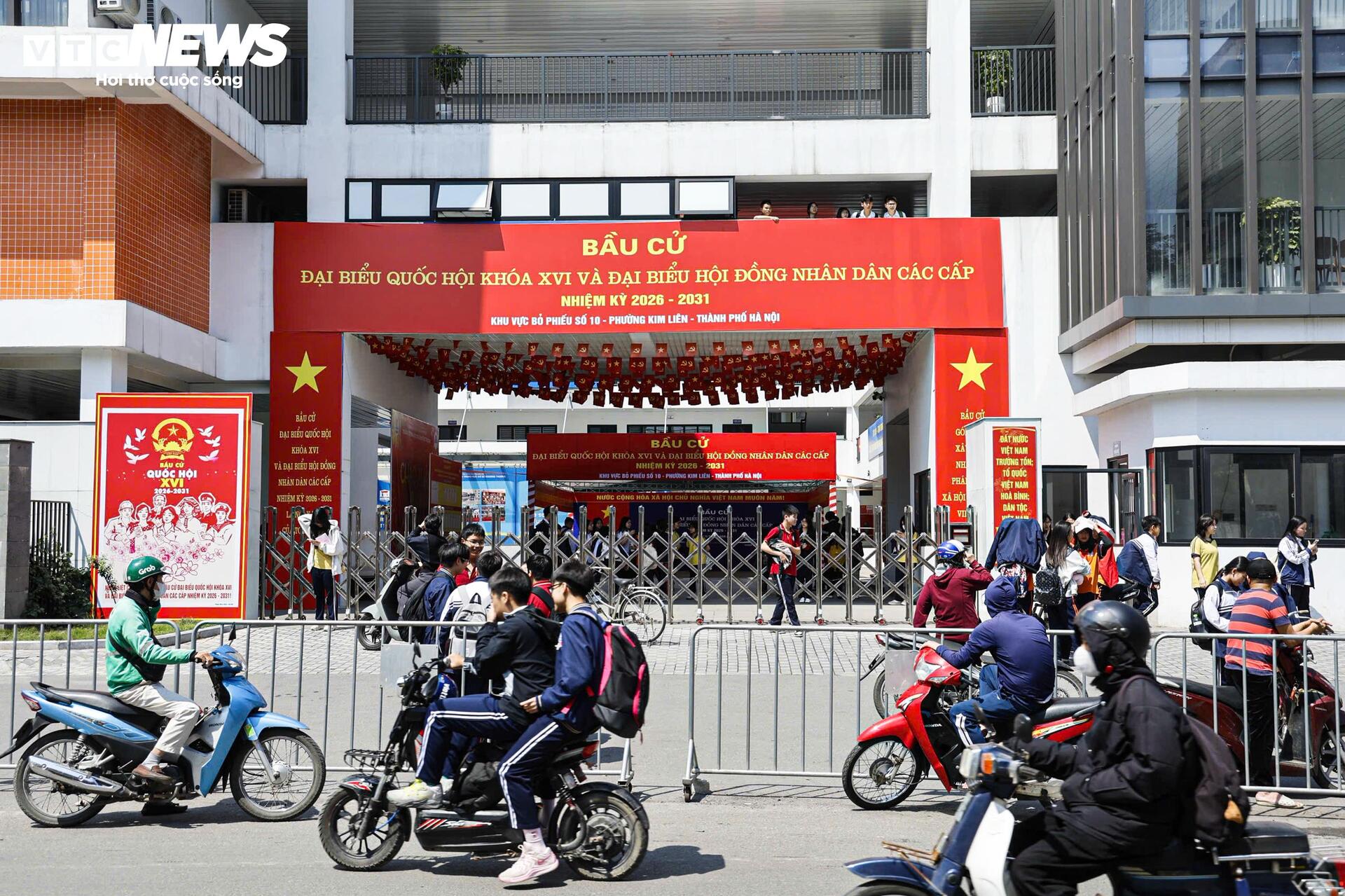Khu vực cổng Trường THPT Phan Đình Phùng, ngôi trường lâu đời với kiến trúc đặc trưng của Hà Nội được trang trí nổi bật với cờ đỏ, băng rôn và các áp phích tuyên truyền về cuộc bầu cử.