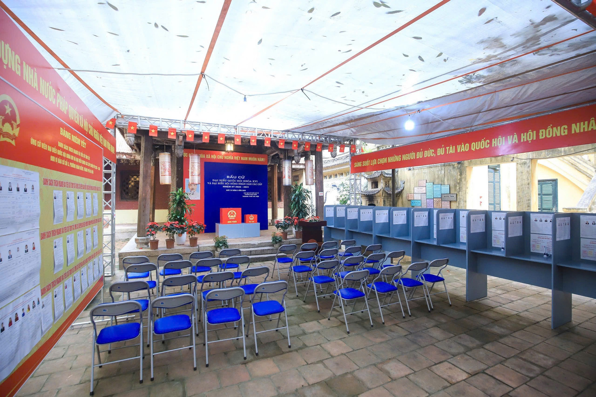 Trong khuôn viên Hội quán, ghế ngồi được bố trí ngay ngắn phục vụ người dân đi bầu cử.
