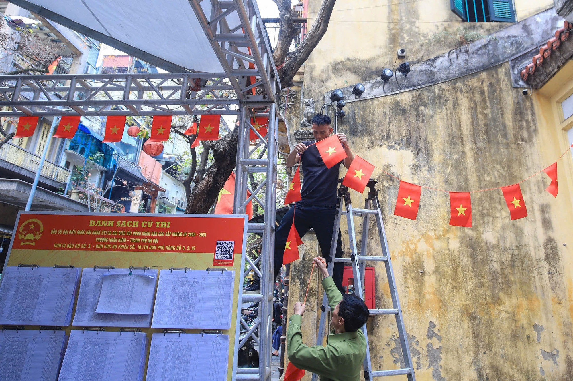 Nhà số 48 Hàng Ngang được treo cờ rực rỡ chuẩn bị đón cử tri tới bỏ phiếu.