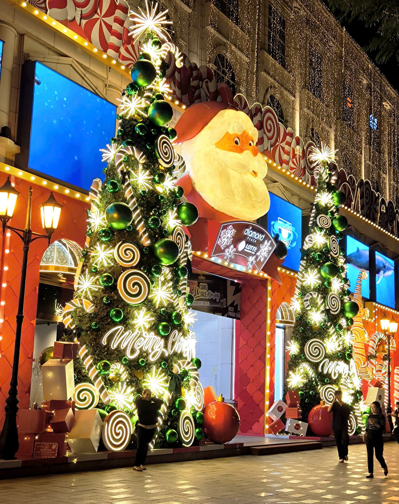 Mỗi năm, các trung tâm thương mại sẽ “tung chiêu” trang hoàng Giáng sinh khác nhau để thu hút khách tham quan, đặc biệt là nhóm khách trẻ. Tại Aeon Mall, không chỉ có các tiểu cảnh, mà còn có khu vực phun tuyết nhân tạo theo khung giờ. Điều này tạo sự bất ngờ cho khách tham quan khi tận hưởng không khí Giáng sinh đúng nghĩa.