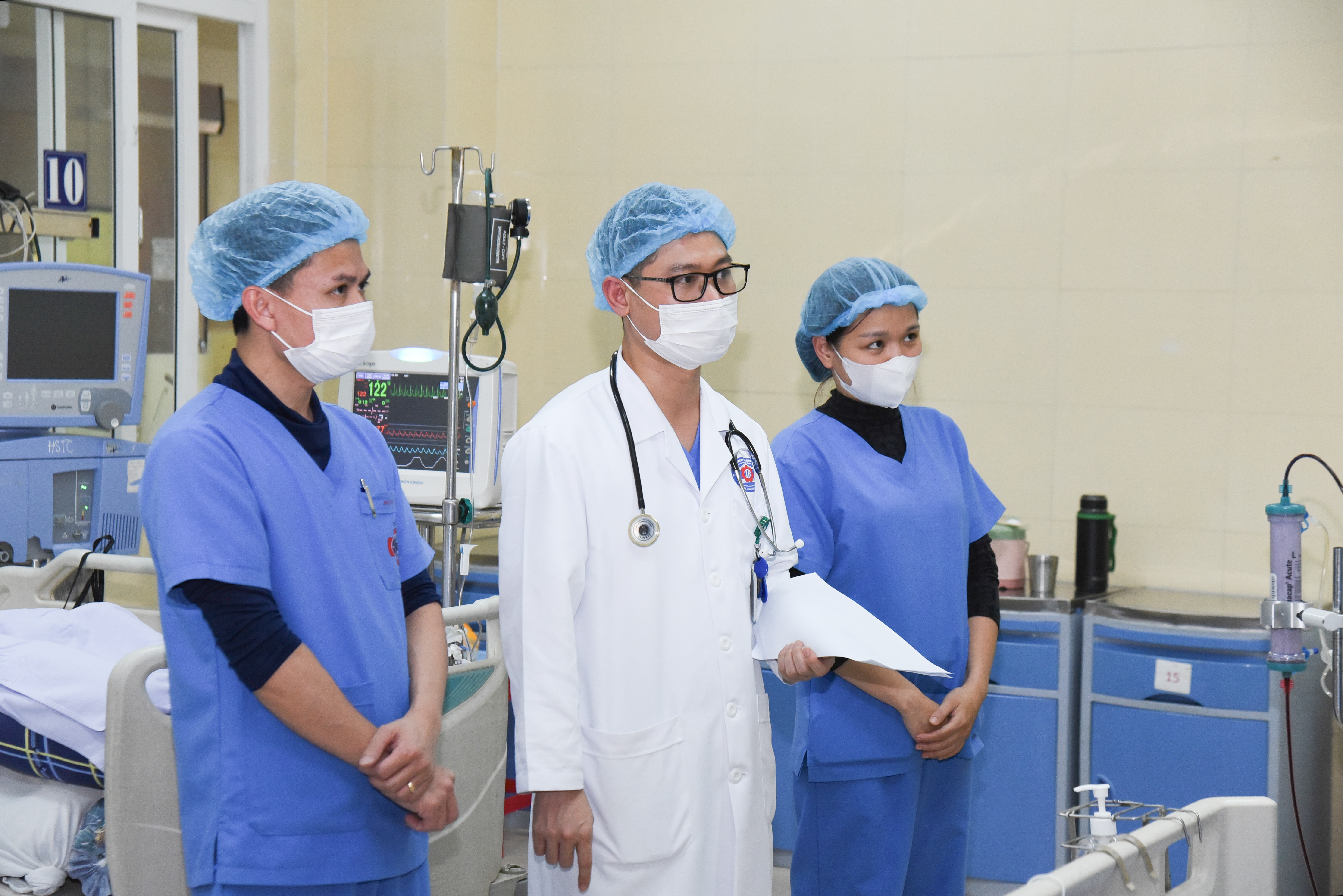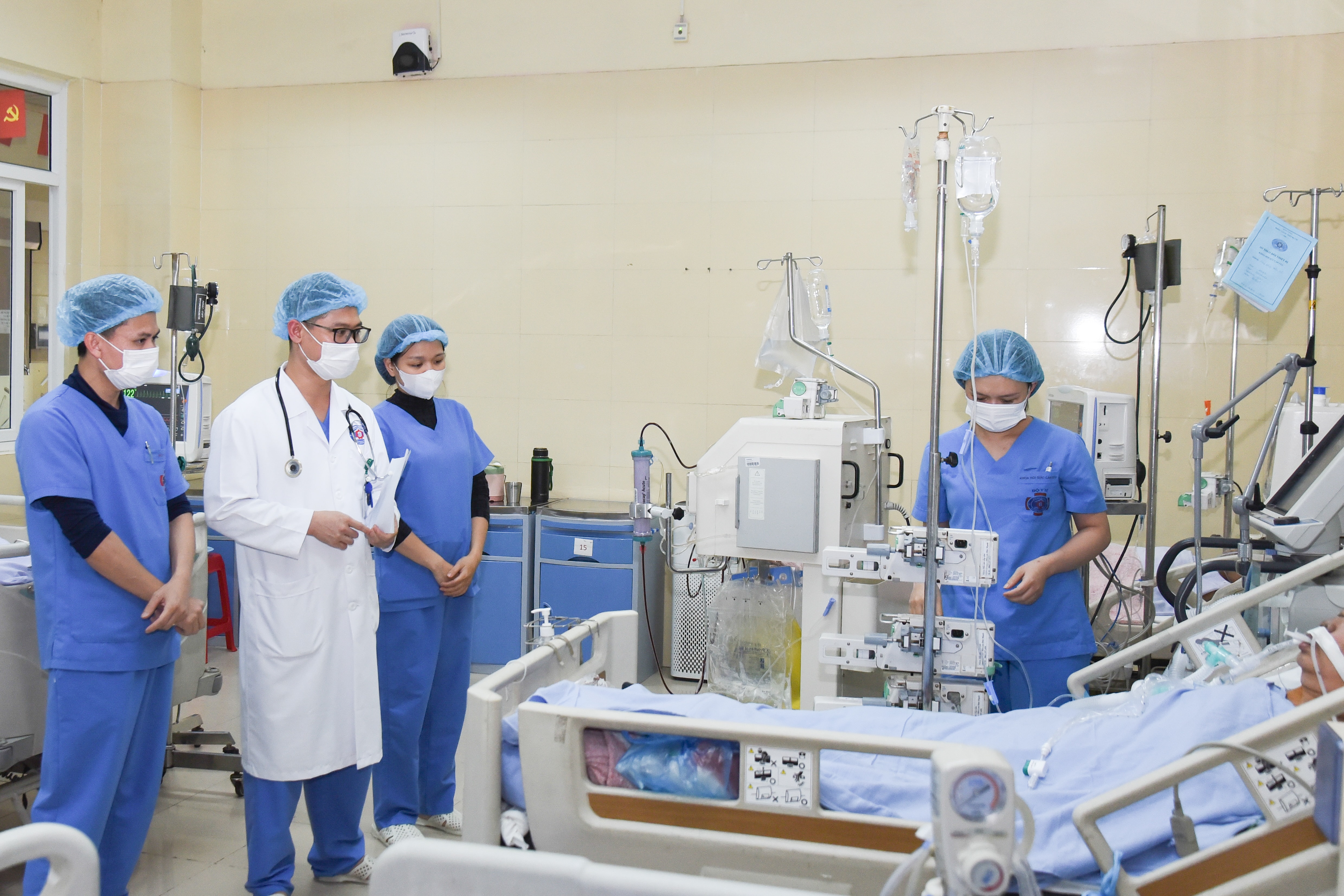 Bác sĩ Tuân và các đồng nghiệp thăm khám một ca bệnh nặng đang điều trị tại Khoa Hồi sức cấp cứu. Ảnh: Xuân Quý