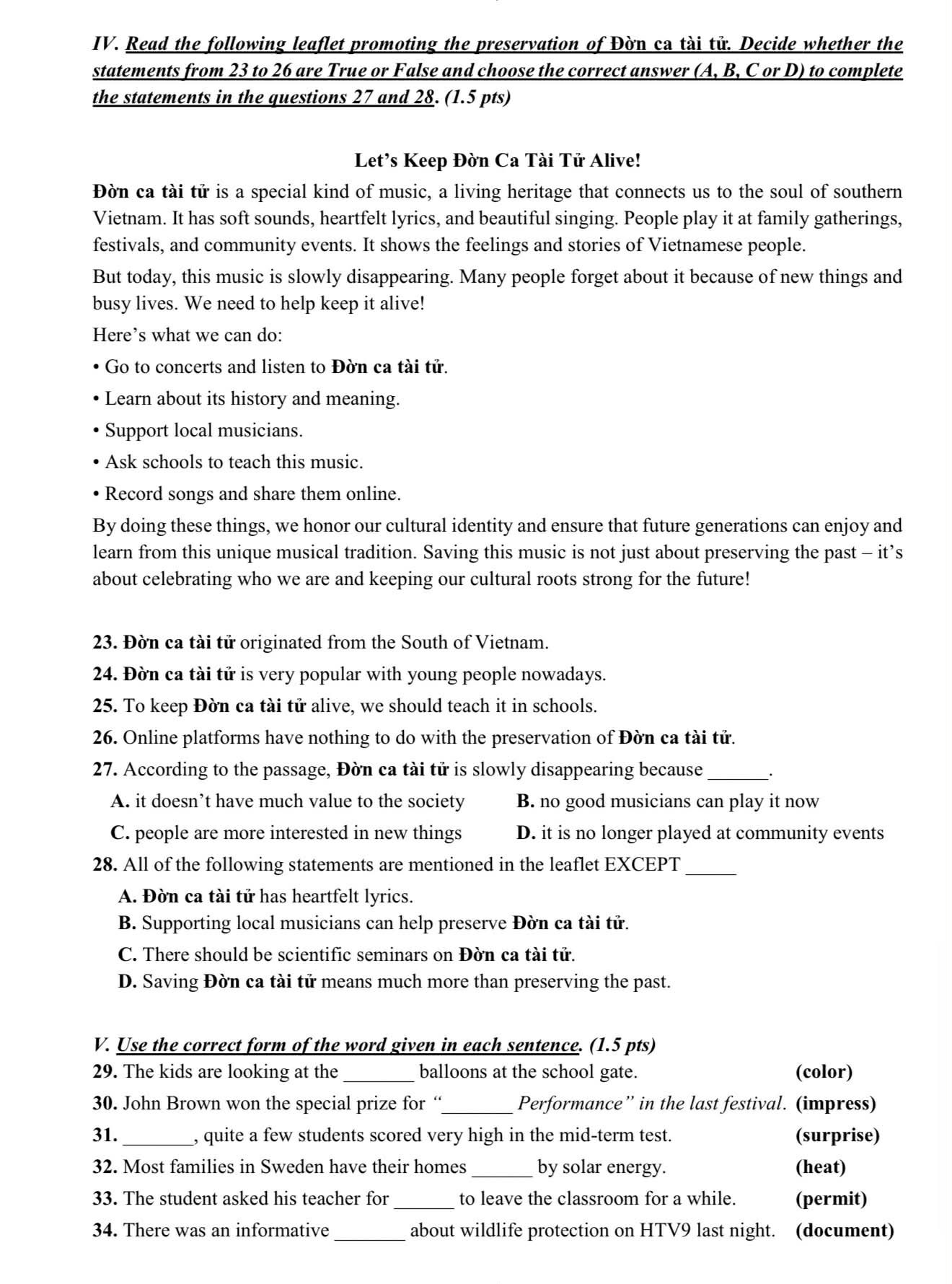 Phần 2 - Từ vựng, ngữ pháp, giao tiếp (3,0 điểm): Câu 5-16.