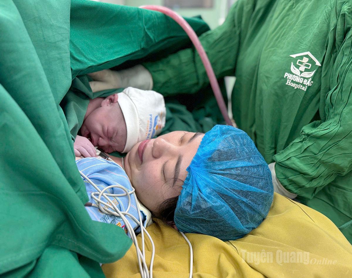 Sau khi chào đời, bé được nhân viên y tế đặt trên ngực mẹ với phương pháp da kề da nhằm kết nối tình yêu thương giữa mẹ và con.