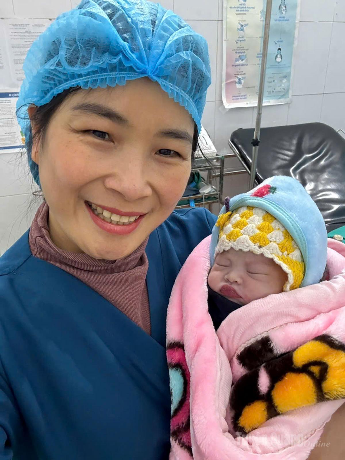 Niềm vui của điều dưỡng Tráng Thị Vàng, Khoa Sản, Bệnh viện ĐK Đức Minh khi vừa chào đón em bé chào đời đúng dịp năm mới. Ảnh: Nguyễn Yếm.