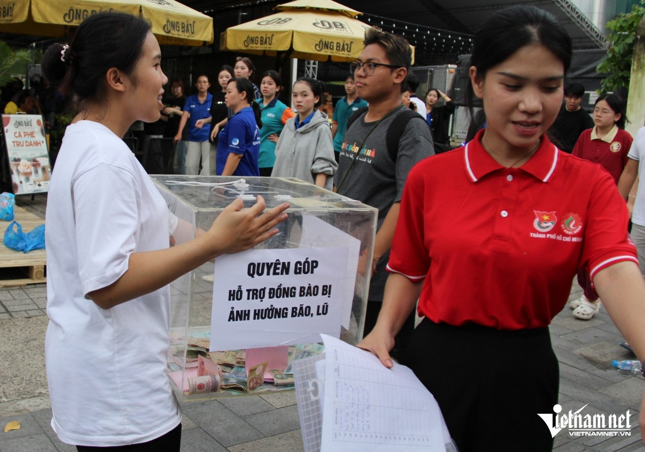 Các tình nguyện viên cho biết ngoài người dân TPHCM, một số khách du lịch nước ngoài cũng ủng hộ đồng bào bị ảnh hưởng bão, lũ bằng tiền mặt. Ảnh: Hà Nguyễn