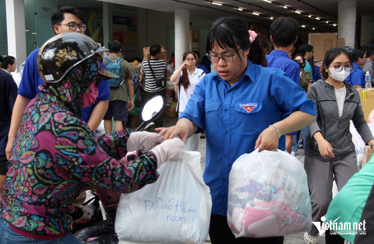 Đông đảo người dân TPHCM chở quần áo, nhu yếu phẩm đến điểm tiếp nhận hàng hóa để gửi hỗ trợ đồng bào vùng lũ. Ảnh: Hà Nguyễn