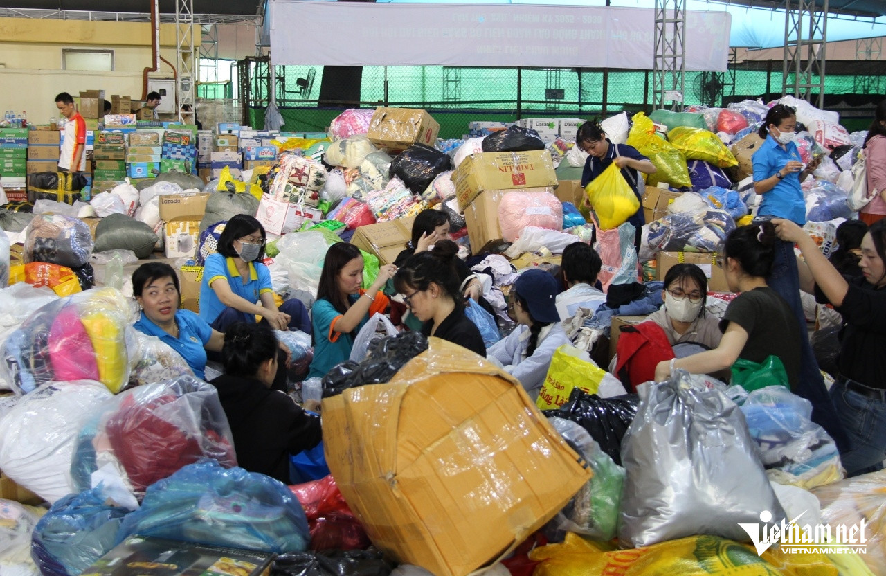 Trong khi đó, nhiều cán bộ, nhân viên, dân quân, đoàn viên thanh niên, tình nguyện viên tại đây... liên tục tiếp nhận, tất bật phân loại, sắp xếp, đóng bịch hàng hóa. Họ thay nhau vận chuyển đồ lên xe tải để chuẩn bị chuyển đi hỗ trợ đồng bào vùng lũ.