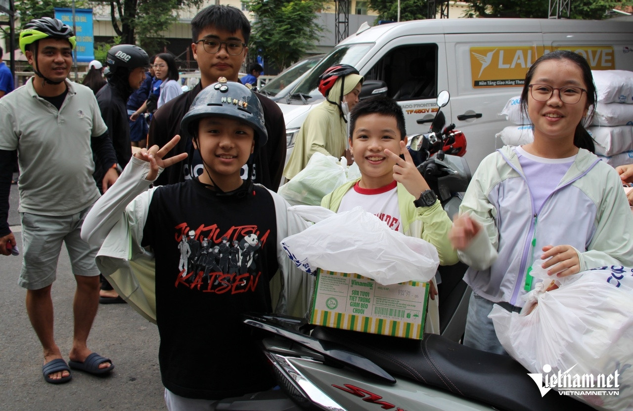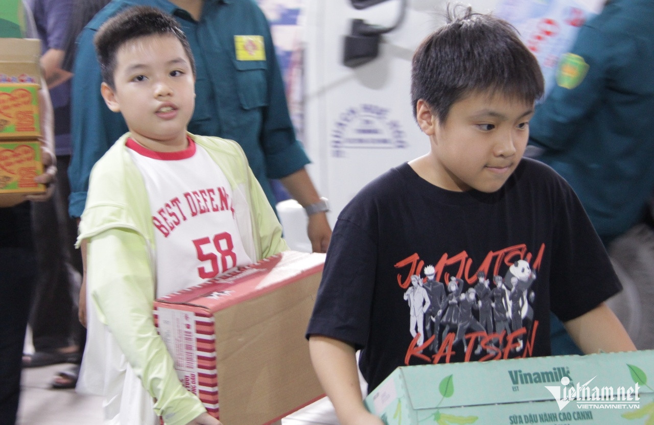 Tại điểm tiếp nhận, em Hoàng Minh Tùng (8 tuổi, con chị Ngân) nhanh chóng cởi áo khoác, bưng từng thùng mì tôm vào nơi tập kết. Dù phải mang nặng, di chuyển nhiều lần, Tùng và các chị, em của mình vẫn cười tươi.