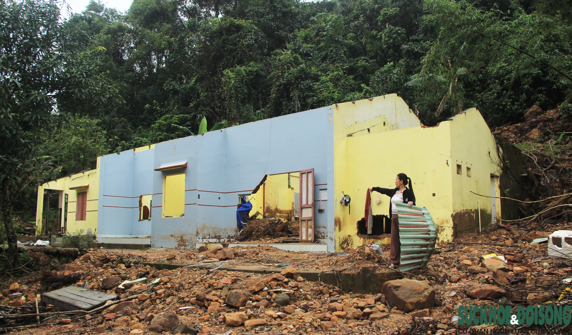 "Hôm ấy, nước lũ vây kín cả xóm. Chạy ra tới đường thì nước đã ngang ngực nhưng không ai dám dừng lại. Khi tới đường bê tông phía trước cũng là lúc trên núi phát ra tiếng nổ lớn, rồi đất đá ào ạt trút xuống, xô sập bức tường nhà ông Linh. Thật sự khủng khiếp…", bà Hường nhớ lại, giọng vẫn còn run run.