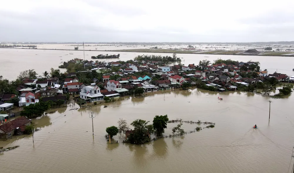 Trưa 23-11, tại thôn Phú Khê 2, xã Hòa Xuân, tỉnh Đắk Lắk, nước lũ đã rút bớt nhưng vẫn còn ngập sâu. Người dân từ trong thôn bơi xuồng ra Quốc lộ 1 để nhận nhu yếu phẩm từ các đoàn thiện nguyện.