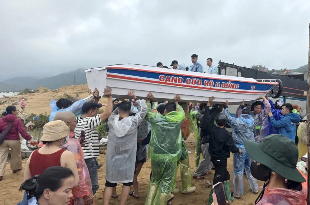 Ngày 23-11, nhiều đoàn thiện nguyện đã mang nhu yếu phẩm đến cứu trợ cho người dân xã Hòa Xuân. Họ mang theo xuồng, jetski (moto nước) đến để tiếp cận những khu vực còn ngập sâu.