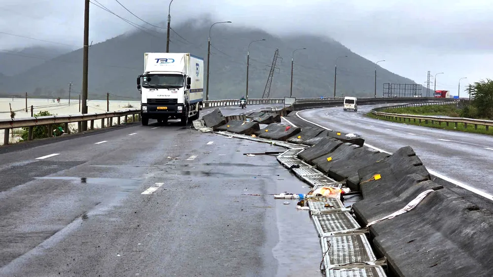 Lũ lớn đã làm Quốc lộ 1 đoạn qua xã Hòa Xuân hư hỏng nặng, những đoạn dài dải phân cách bị nước lũ xô đỗ còn nằm ngổn ngang.