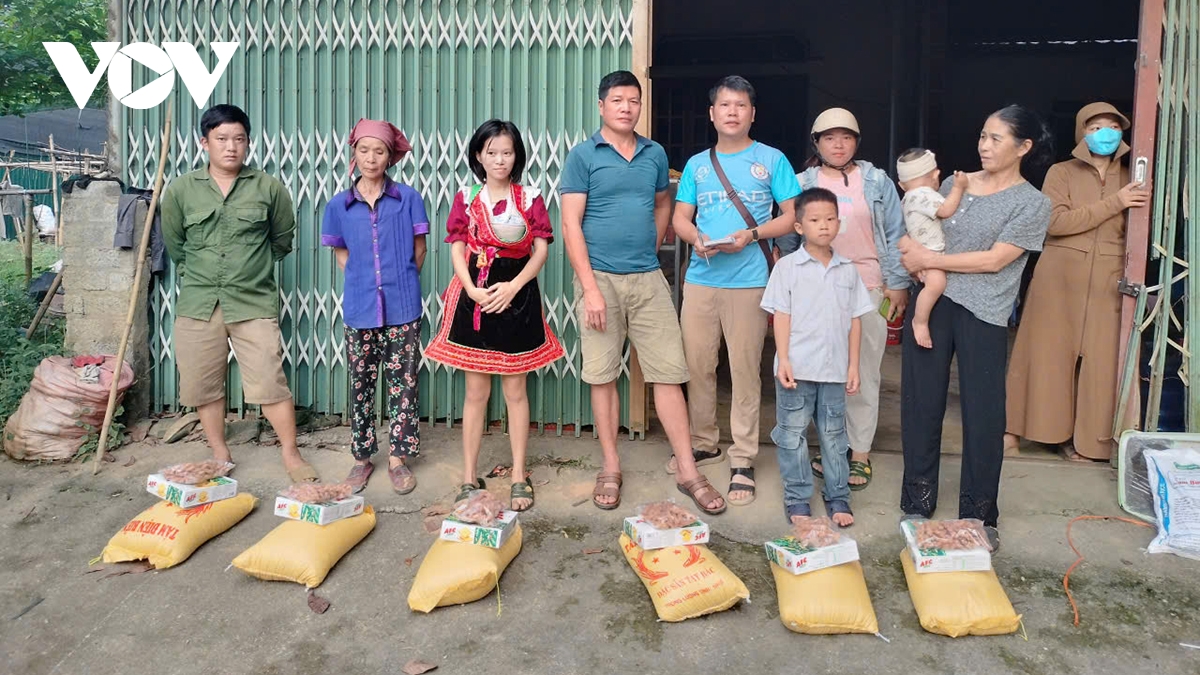 Anh Lường Văn Đinh, Cán bộ mặt trân thôn Nà Làm, xã Nà Phặc (áo xanh, đeo túi ở giữa ảnh) kêu gọi các nhà hảo tâm ủng hộ gia đình khó khăn trong thôn sau những trận mưa lũ vừa quan