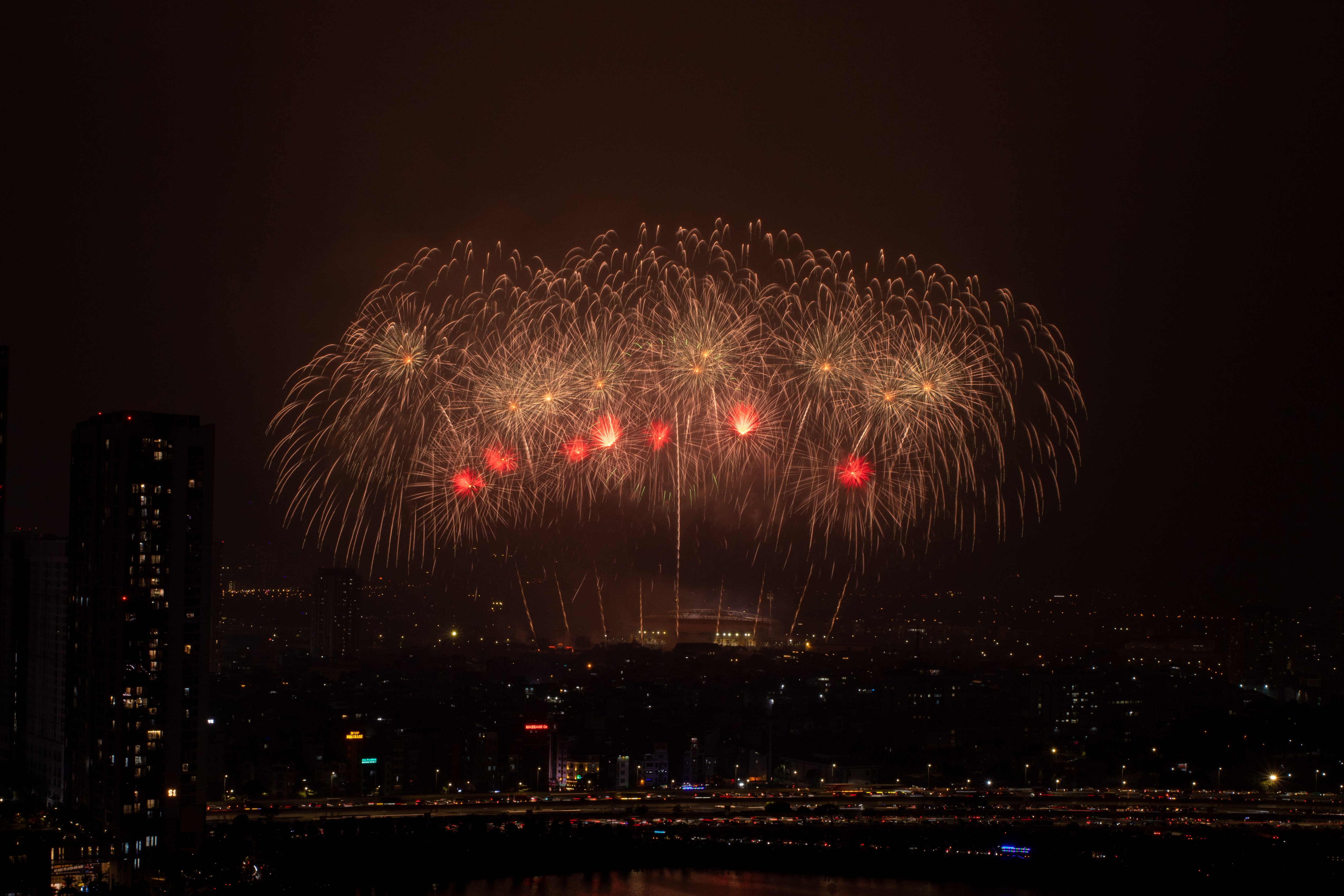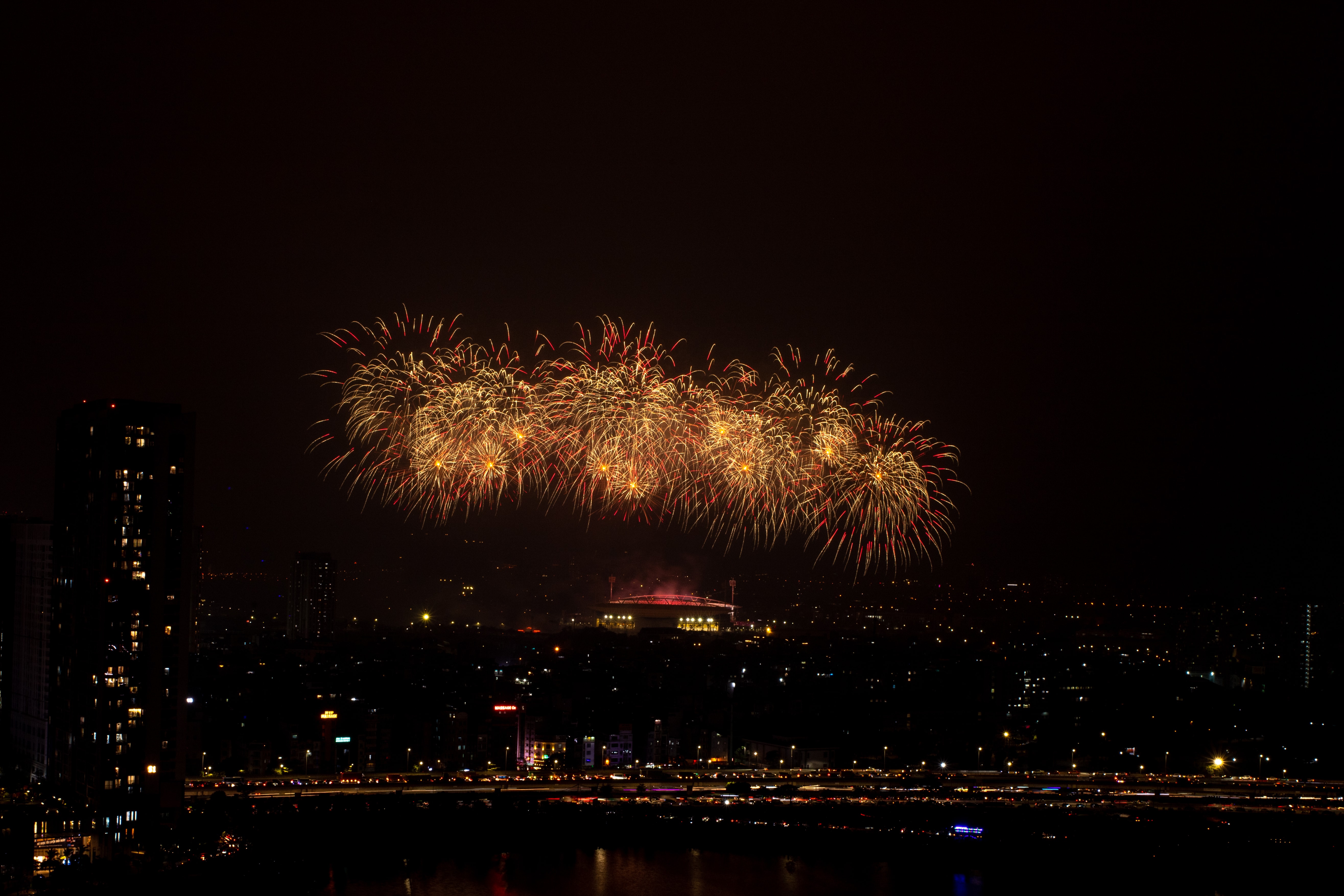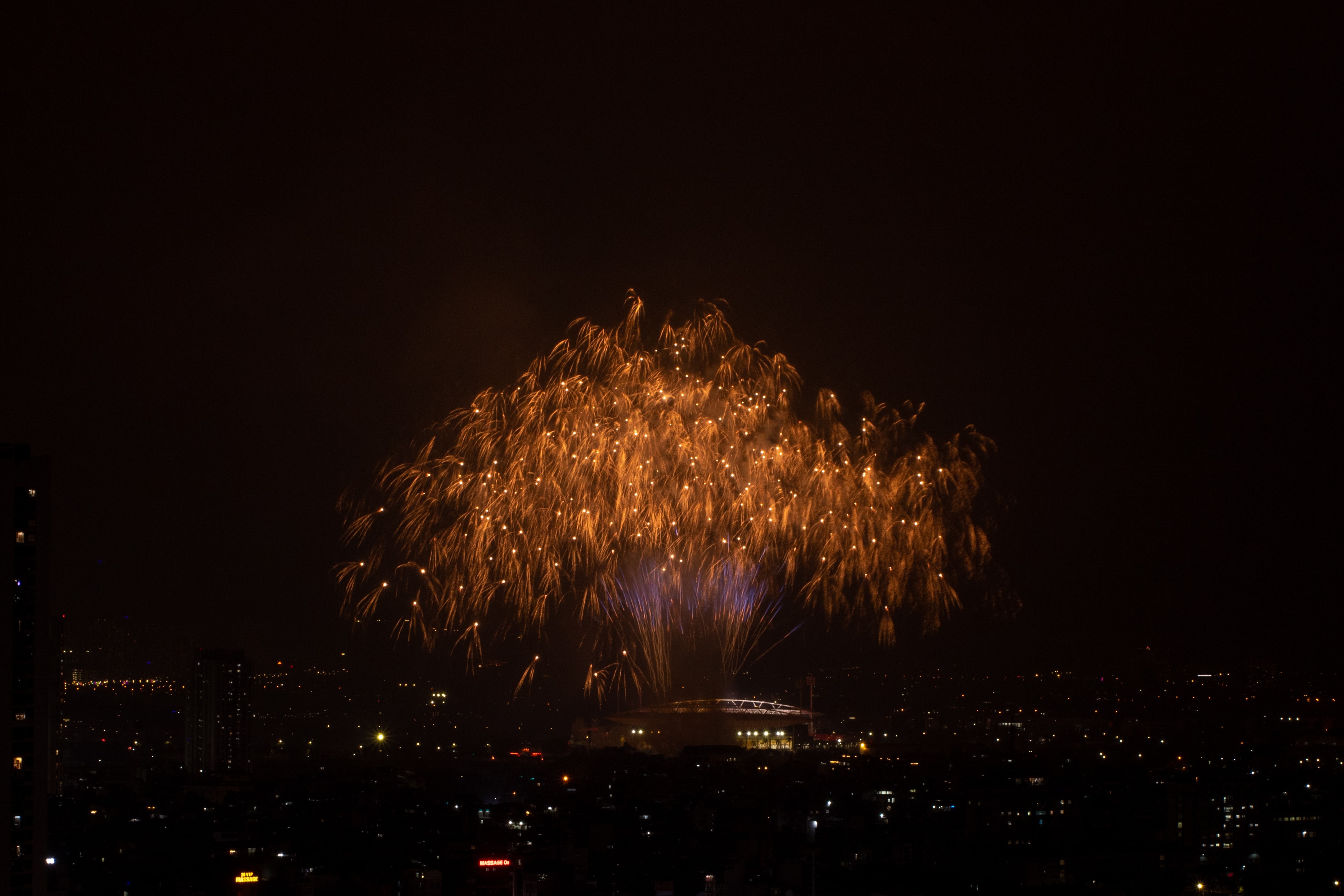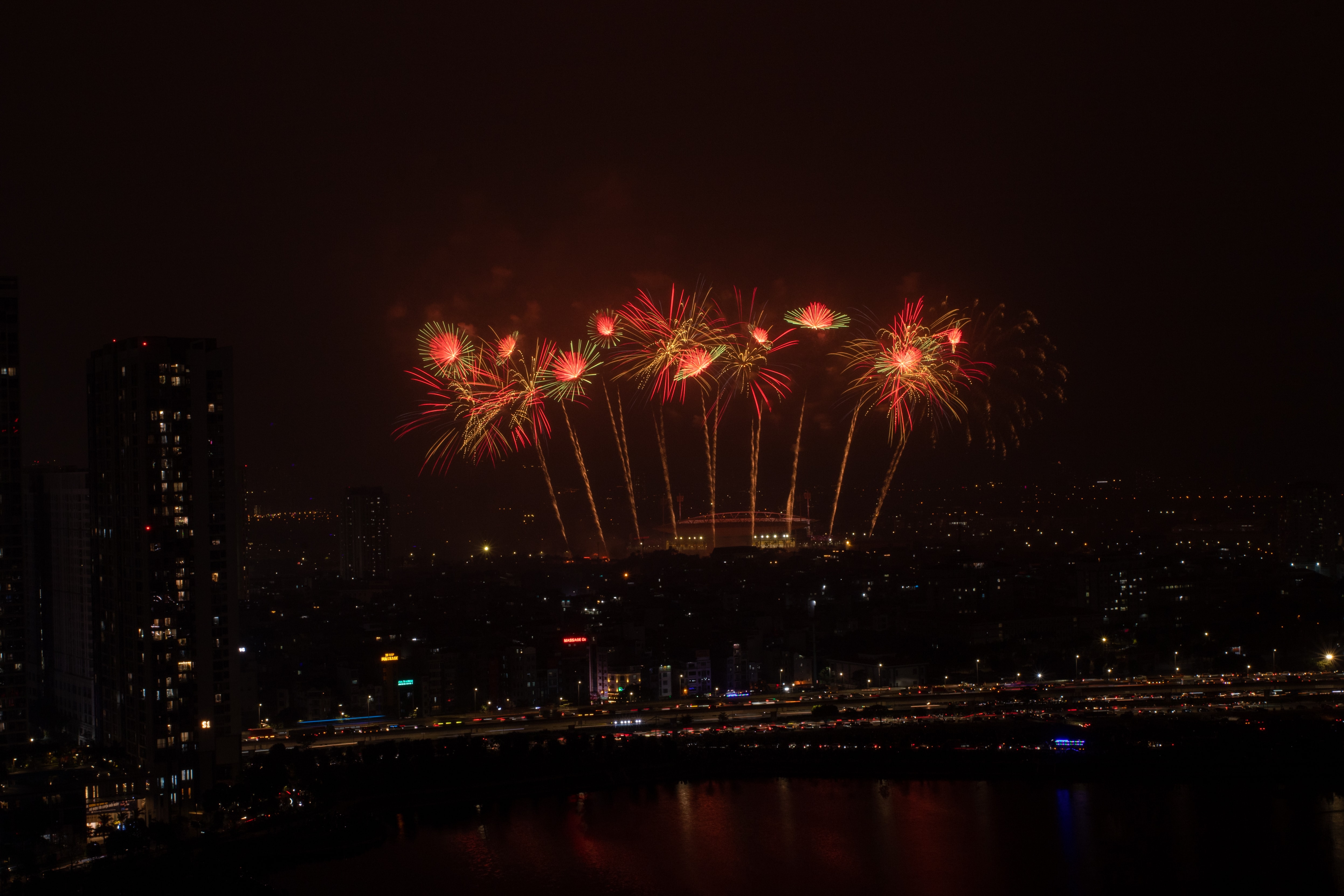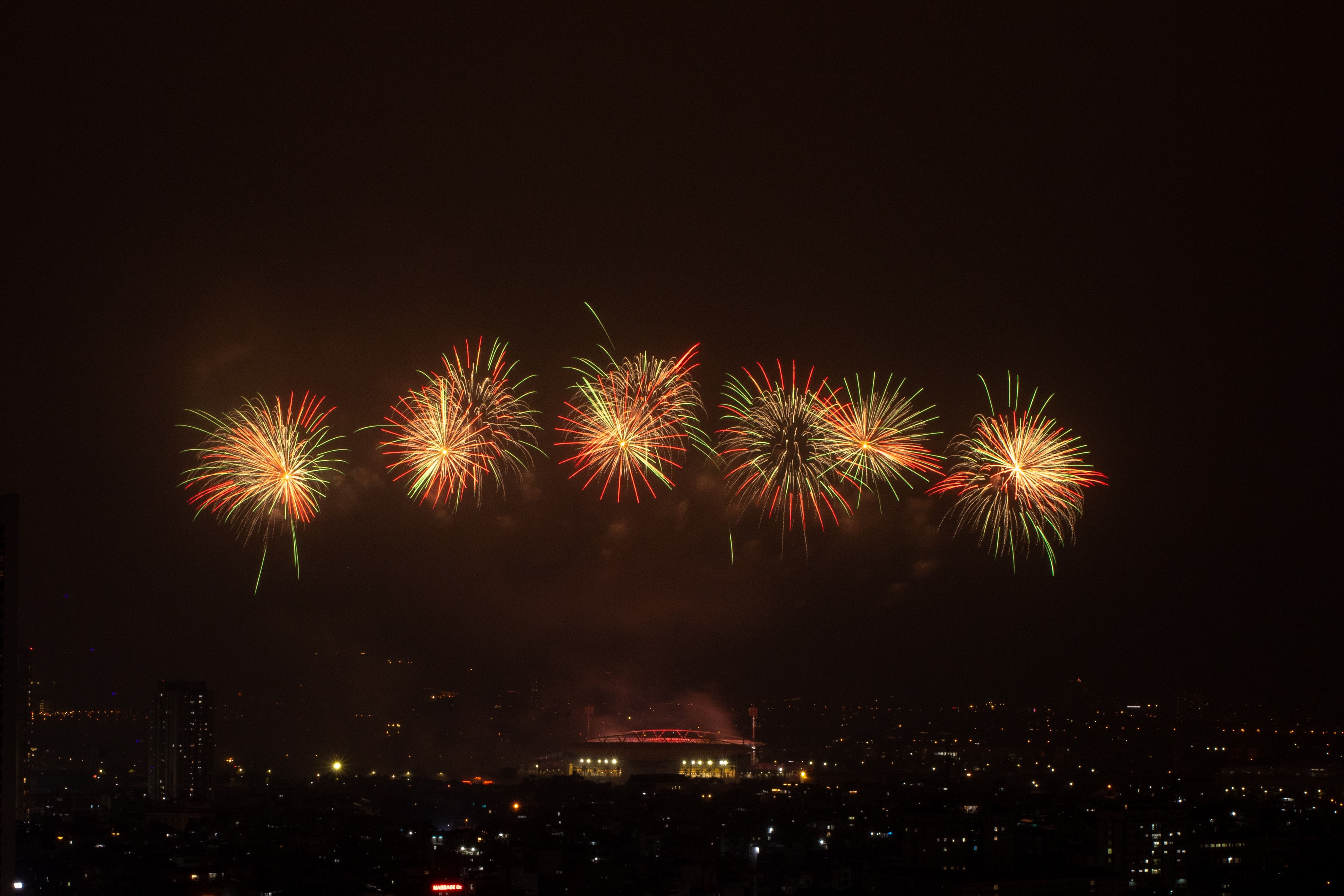 Từ rất xa có thể quan sát màn pháo hoa tầm cao tại sân Mỹ Đình.