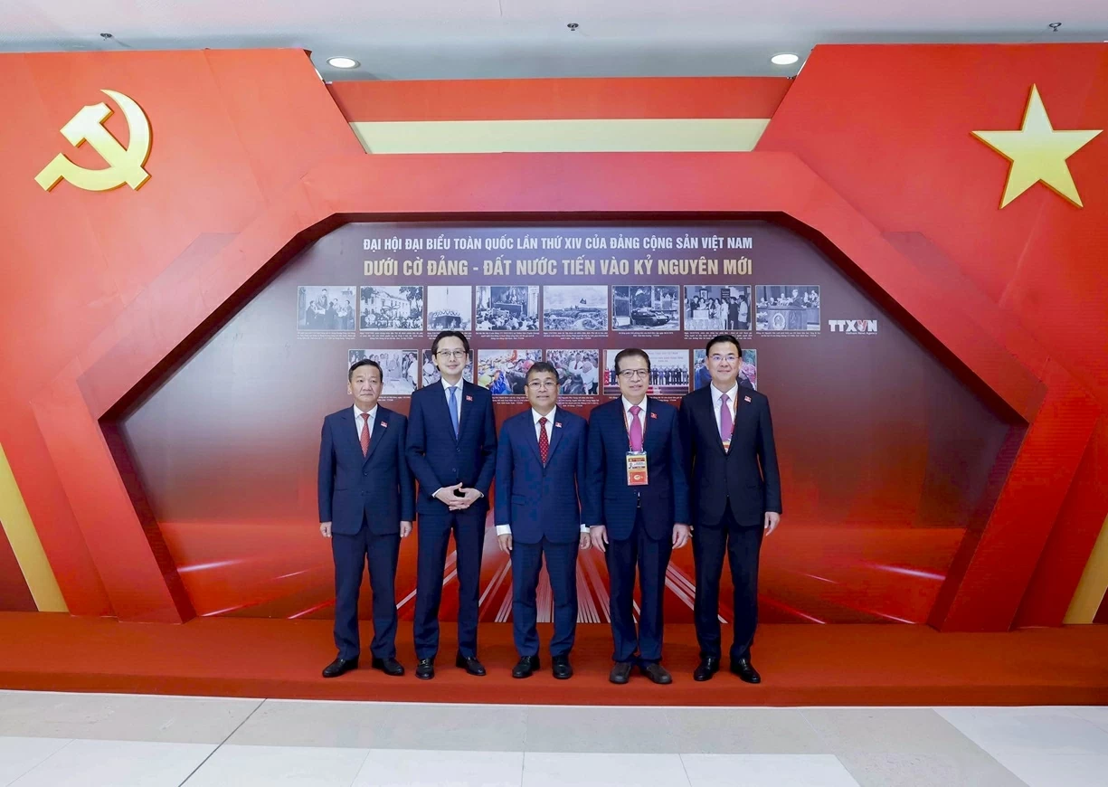Ủy viên dự khuyết Trung ương Đảng, Thứ trưởng Thường trực Bộ Ngoại giao Nguyễn Minh Vũ chụp ảnh cùng các Trưởng cơ quan đại diện ngoại giao Việt Nam ở nước ngoài về tham dự Đại hội XIV của Đảng với tư cách đại biểu chỉ định. (Ảnh: P. Hải)