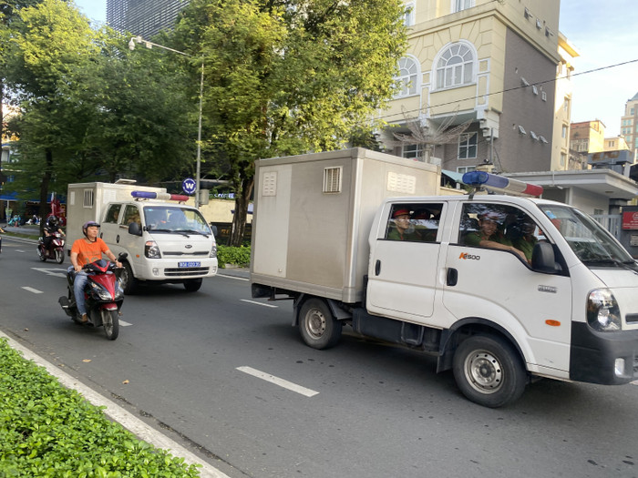 Xe chuyên dụng đưa các bị cáo đến tòa.