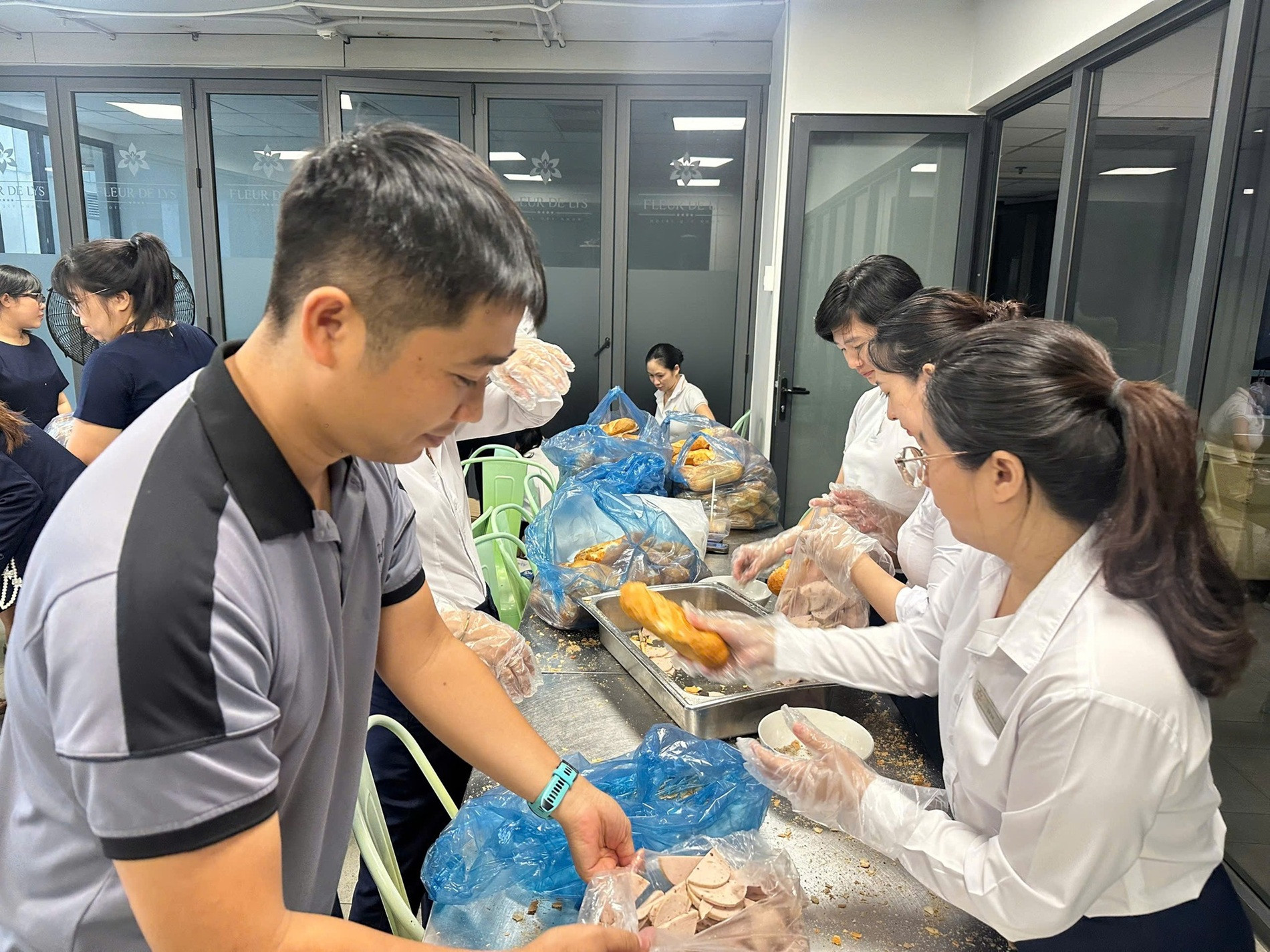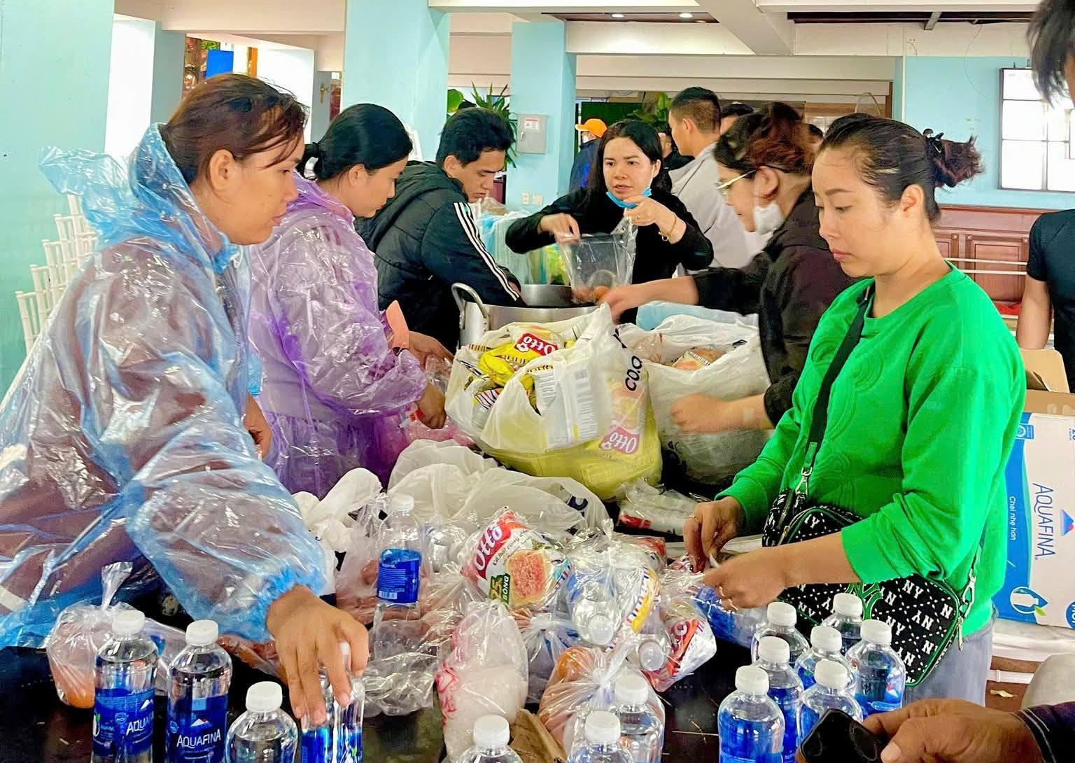 Tại một khách sạn trên đường Nguyễn Huệ (phường Quy Nhơn), bếp ăn thiện nguyện đỏ lửa từ lúc trời vừa sáng. Từng ổ bánh mì, từng suất cơm nóng được chuẩn bị liên tục để gửi đến bà con vùng sâu.