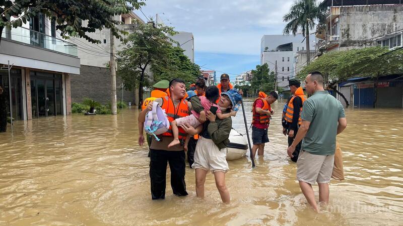 Trong sáng 8/10, nhiều gia đình vẫn chạy lũ, bảo toàn tính mạng.