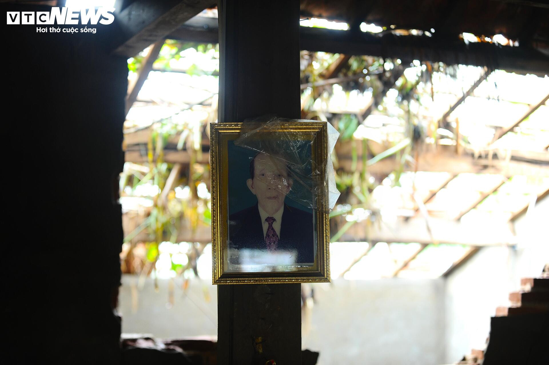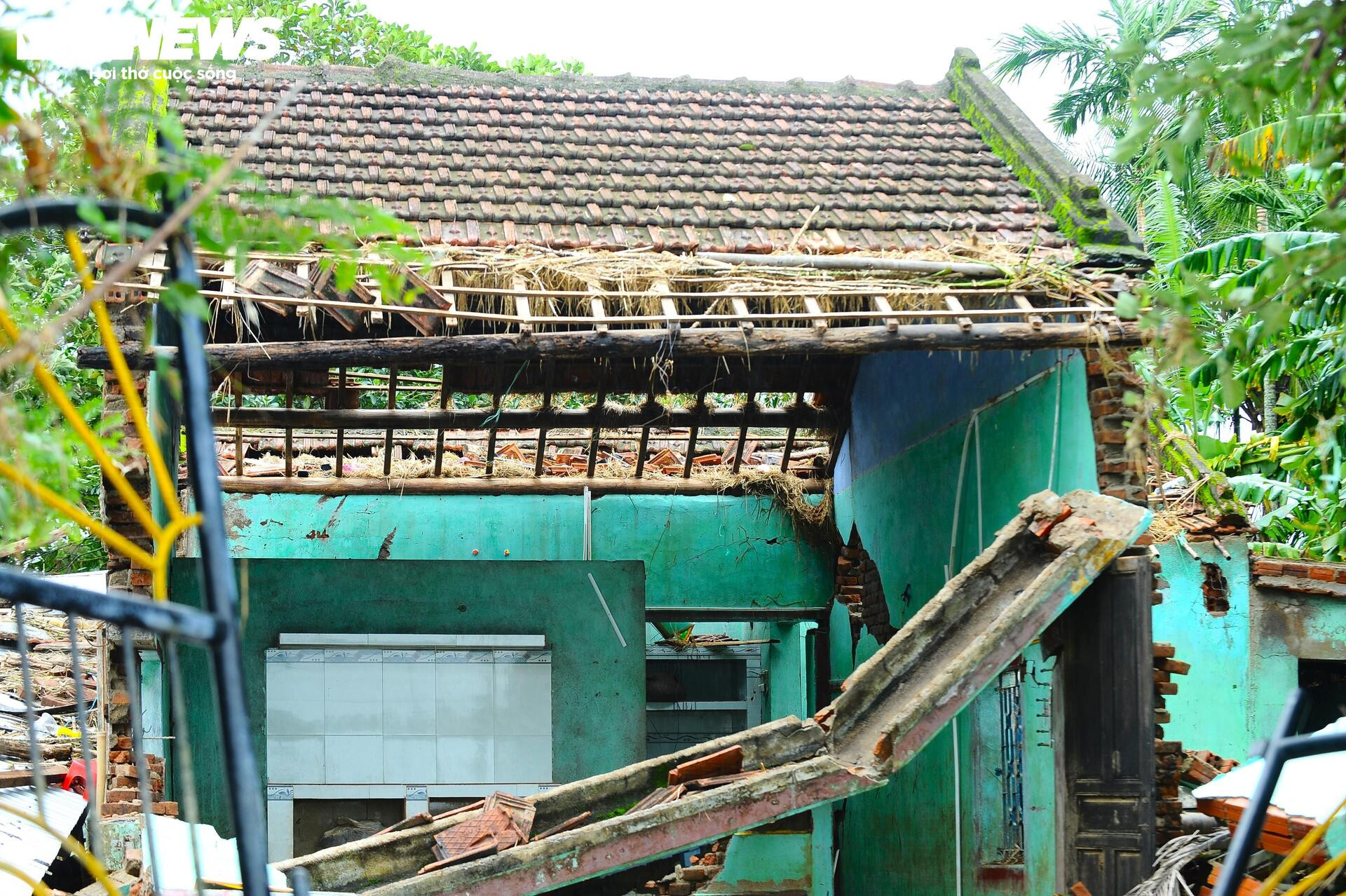 Căn nhà của ông Lê Văn Minh (90 tuổi) cũng sập đổ, ngả nghiêng. Vợ chồng ông đã được đưa đi bệnh viện chăm sóc.